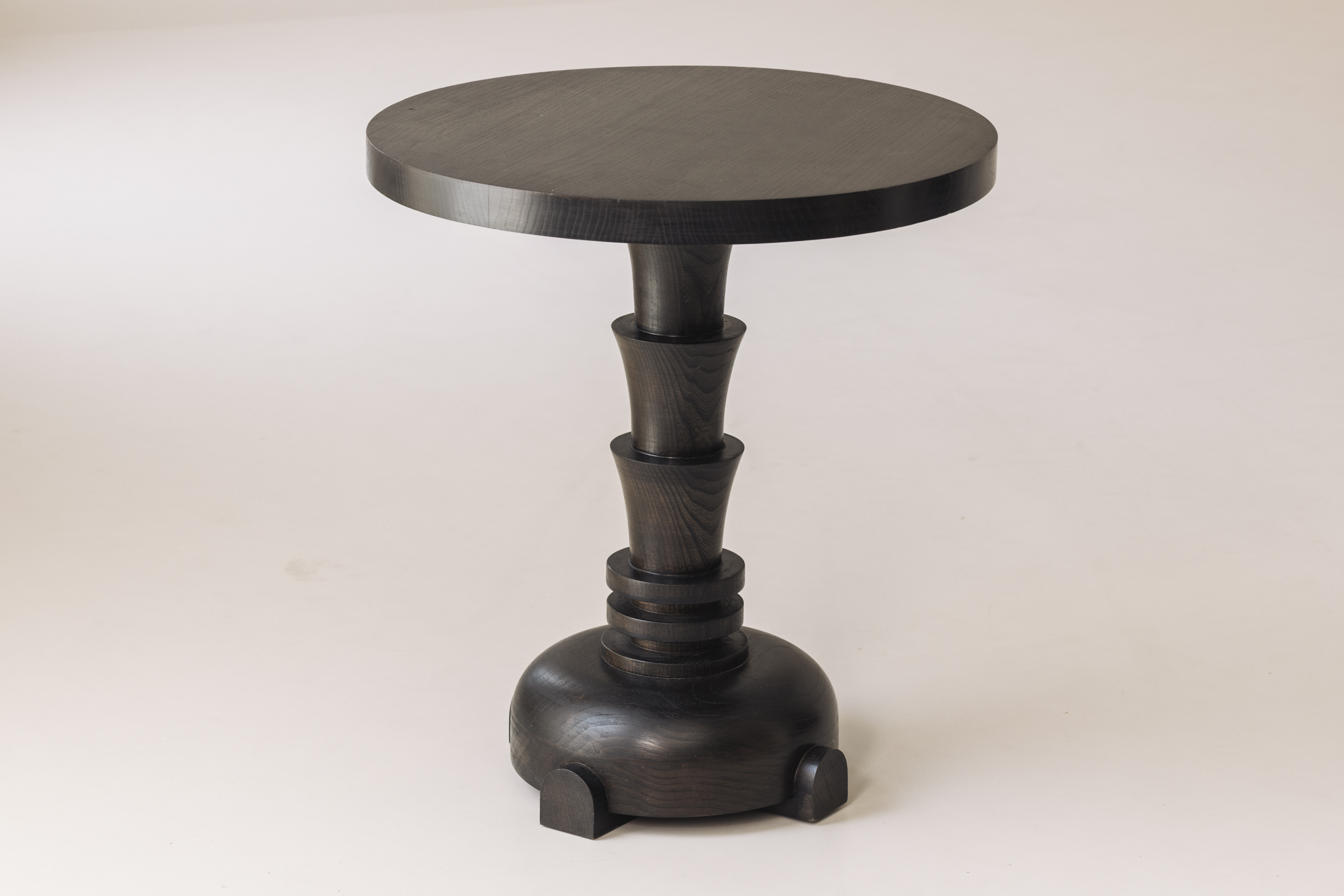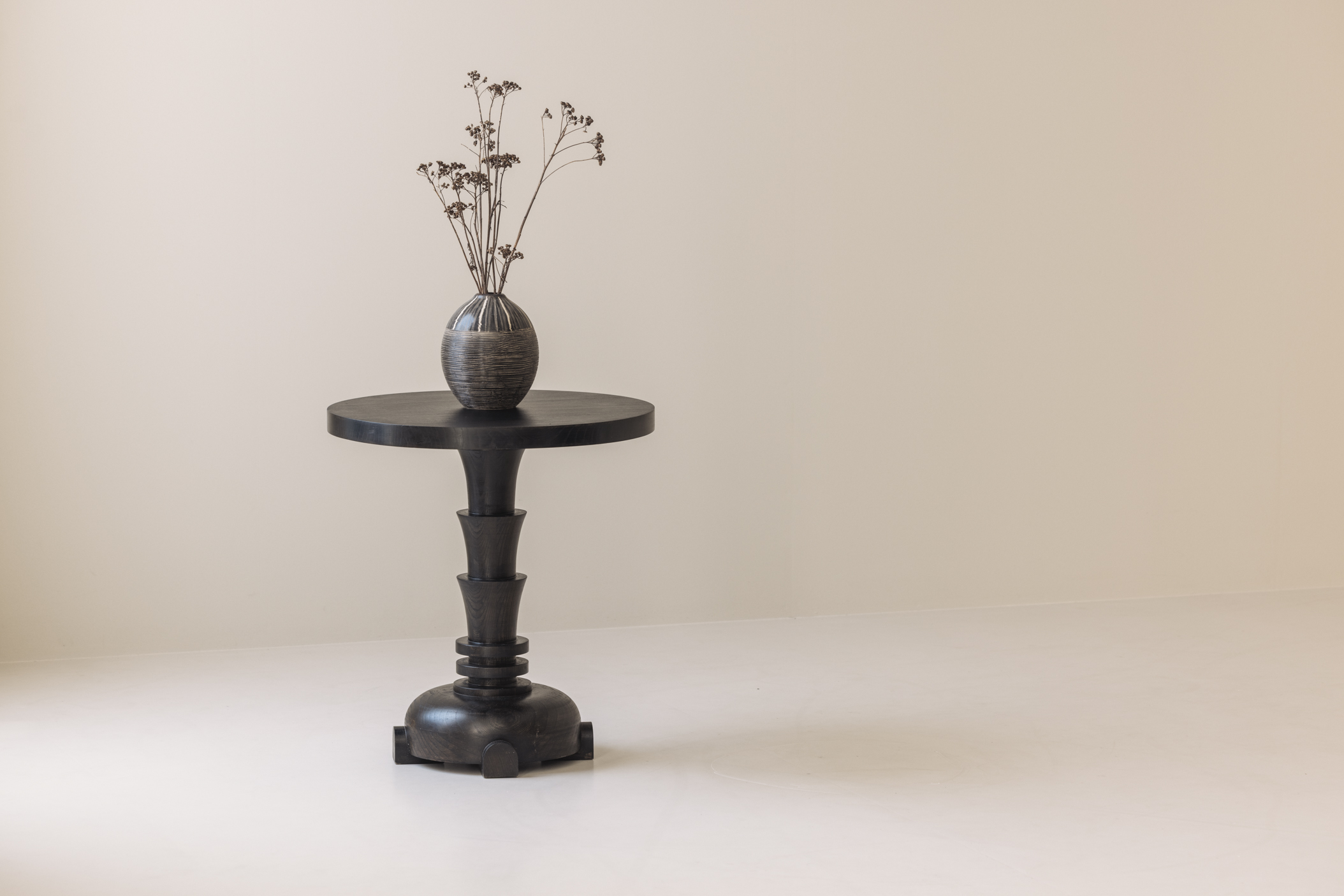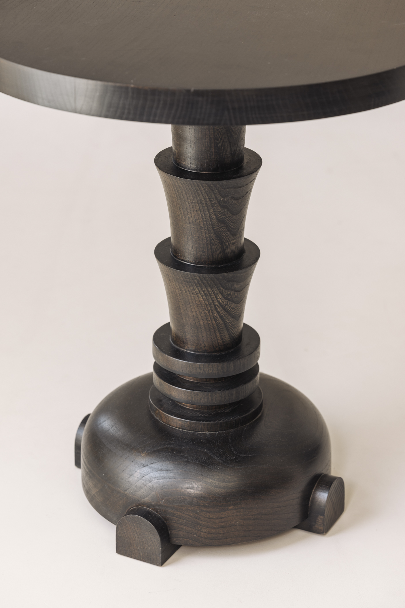 A French sculptural dark stained side table from the 1980s, thoughtfully designed in the spirit of Art Deco. With its bold silhouette and rhythmic geometric forms, this piece captures the elegance and drama of the Art Deco era while embracing a more contemporary material presence. The table features a round top supported by a tiered, geometric pedestal base. The base combines stacked cylindrical elements and stepped detailing, anchored by a rounded foot with carved supports—evoking a modern reinterpretation of 1930s glamour. Perfect as a statement piece beside a sofa or lounge chair, or as a pedestal for art or lighting, this table lends sculptural interest to any setting. Presented in its original untouched condition.