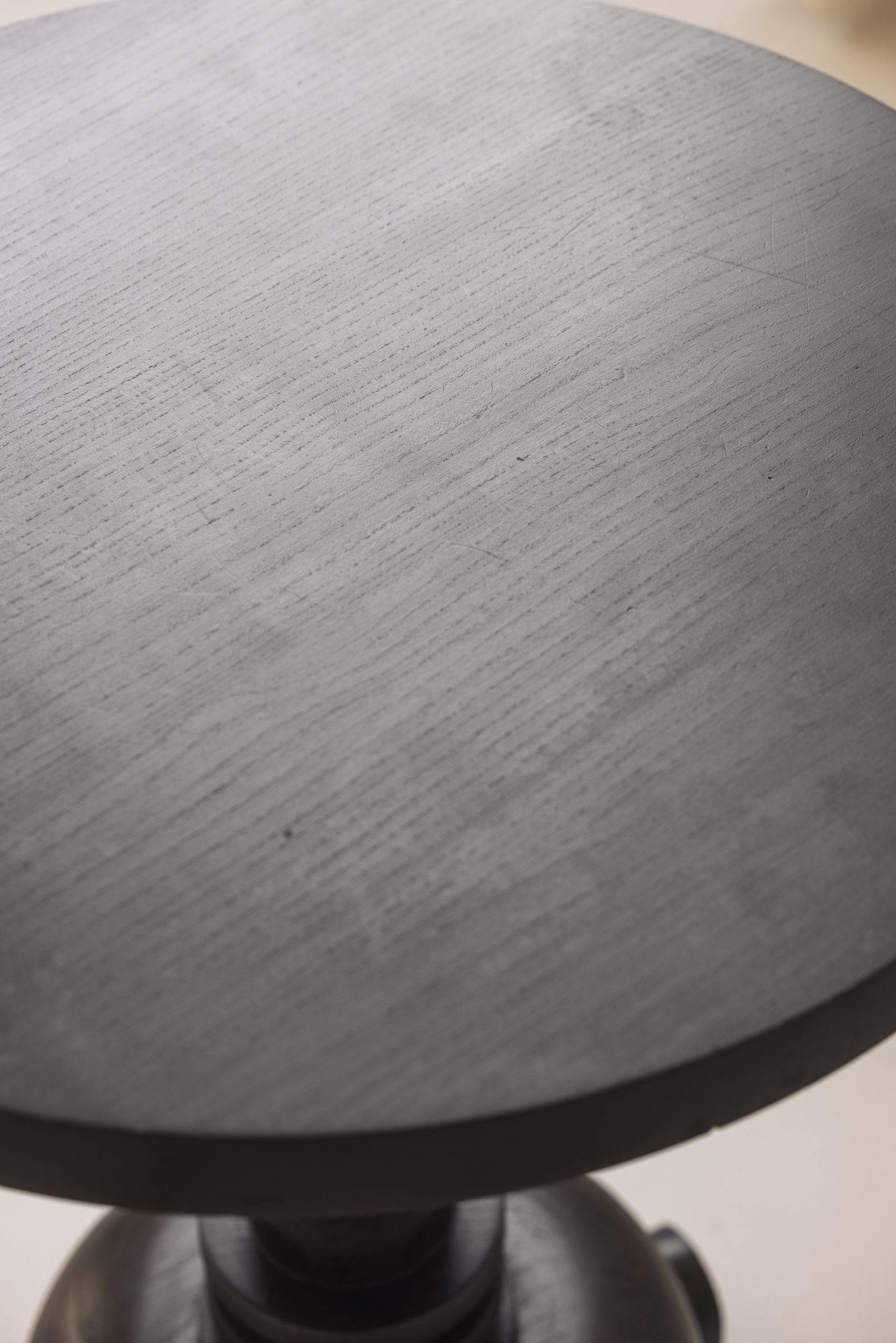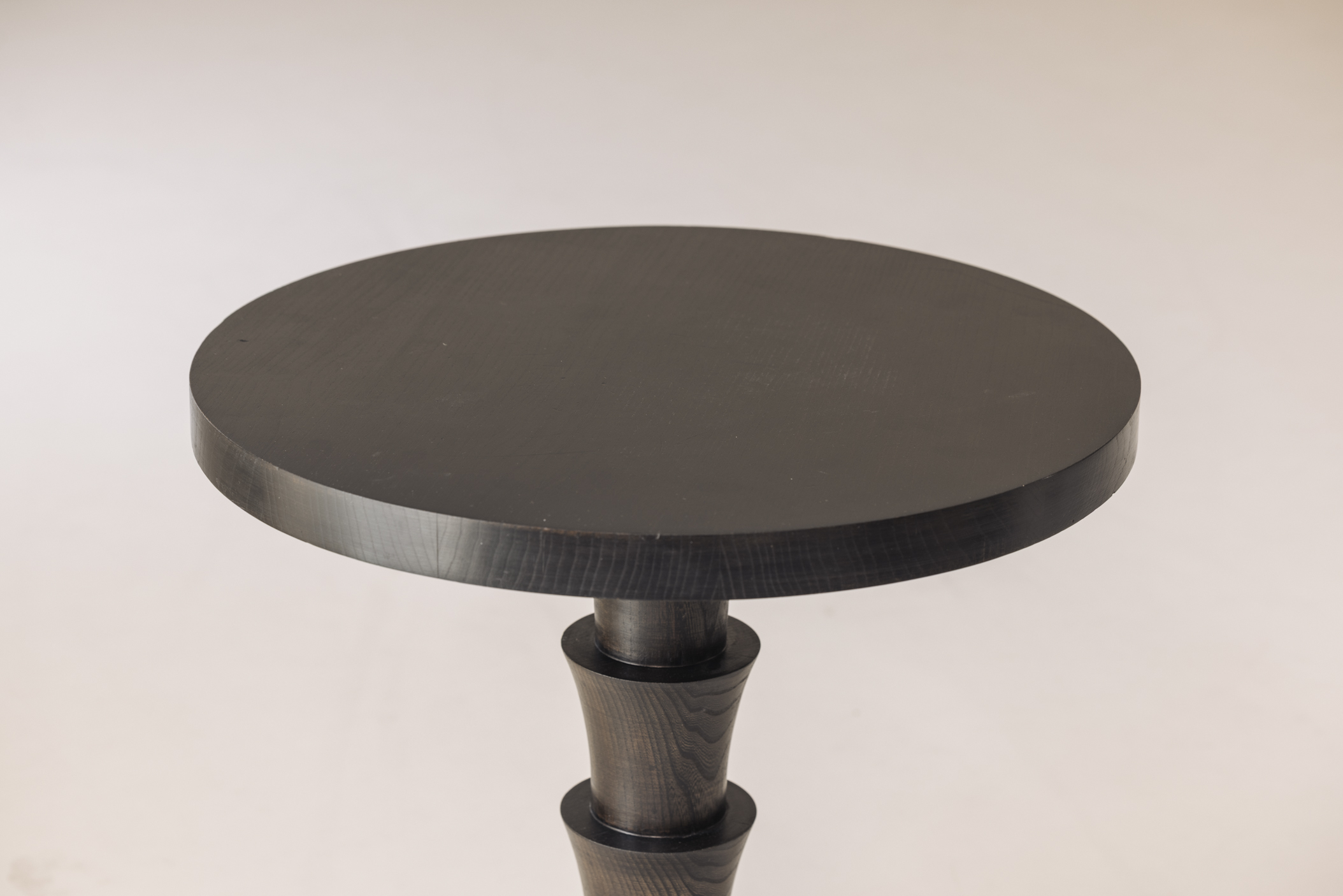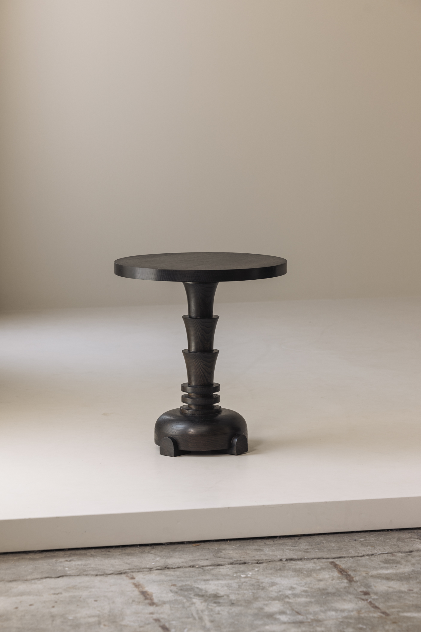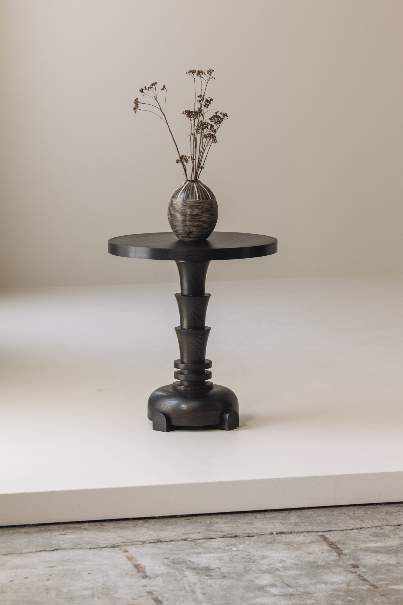 A French sculptural dark stained side table from the 1980s, thoughtfully designed in the spirit of Art Deco. With its bold silhouette and rhythmic geometric forms, this piece captures the elegance and drama of the Art Deco era while embracing a more contemporary material presence. The table features a round top supported by a tiered, geometric pedestal base. The base combines stacked cylindrical elements and stepped detailing, anchored by a rounded foot with carved supports—evoking a modern reinterpretation of 1930s glamour. Perfect as a statement piece beside a sofa or lounge chair, or as a pedestal for art or lighting, this table lends sculptural interest to any setting. Presented in its original untouched condition.
