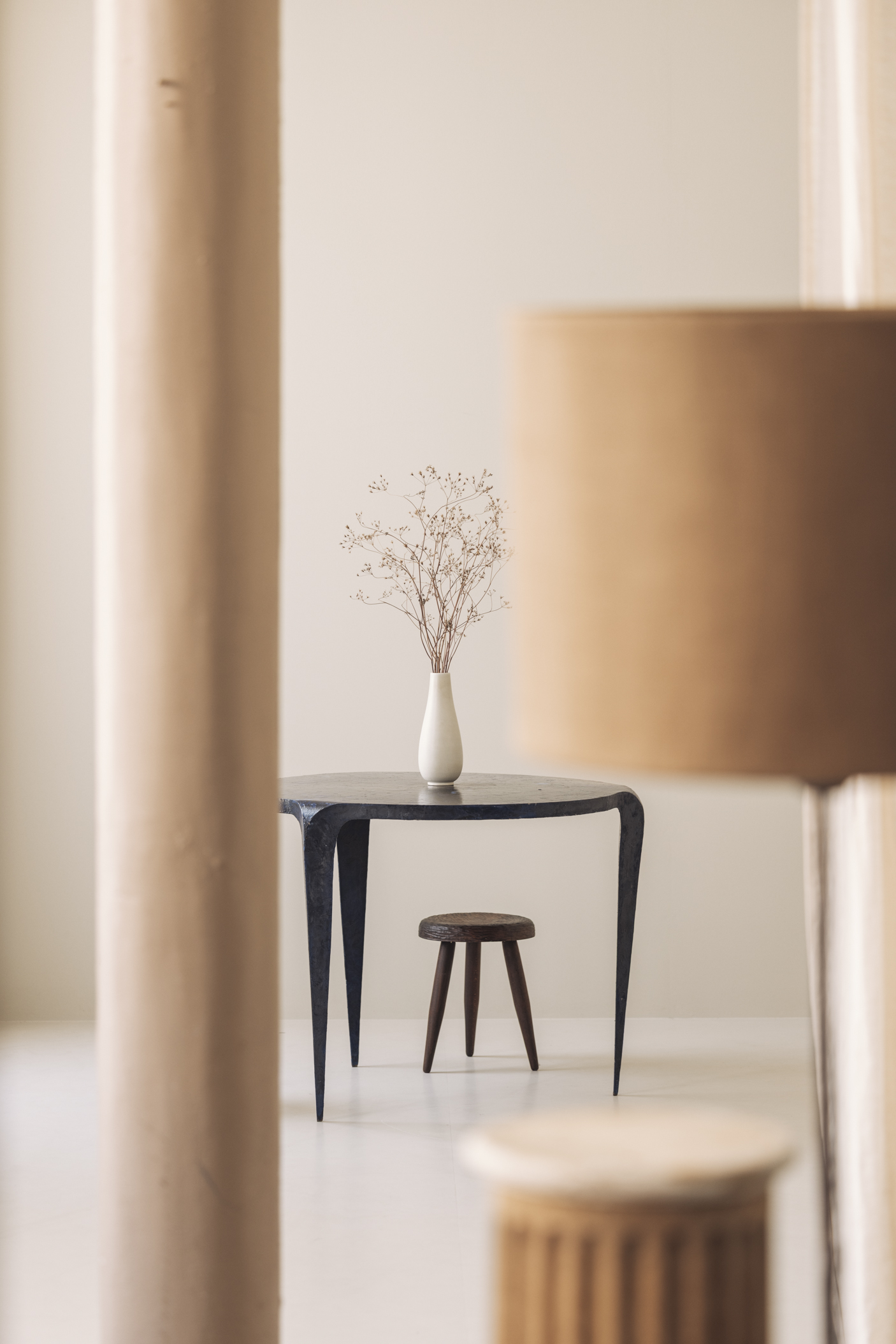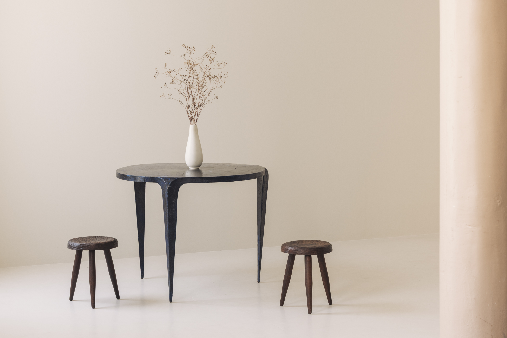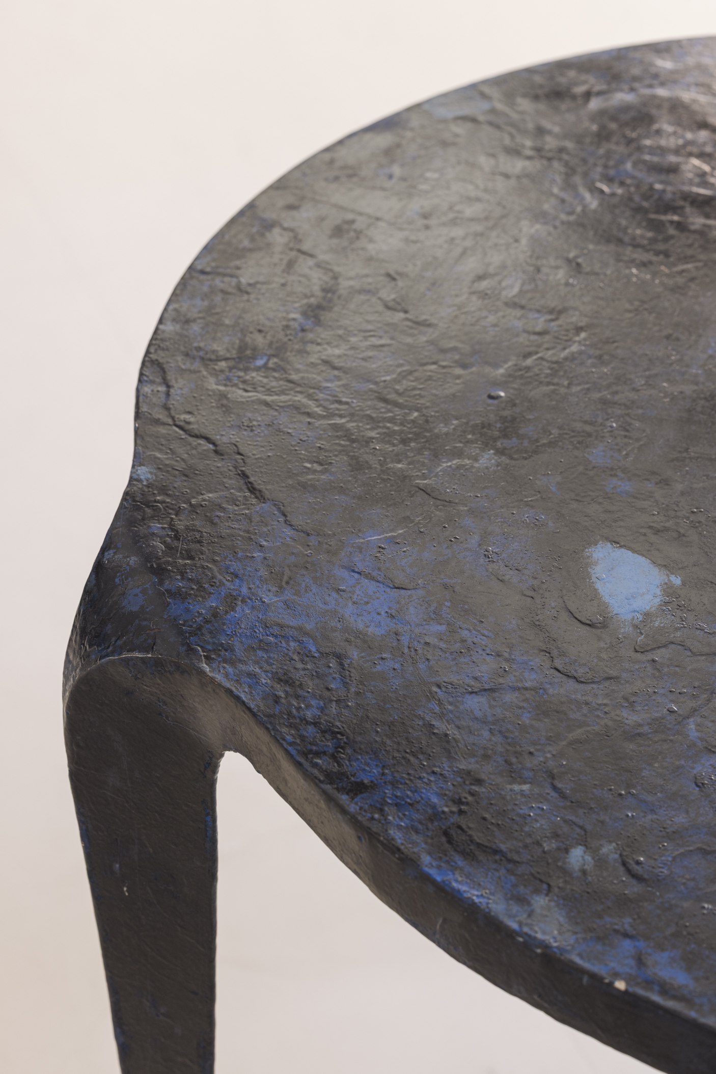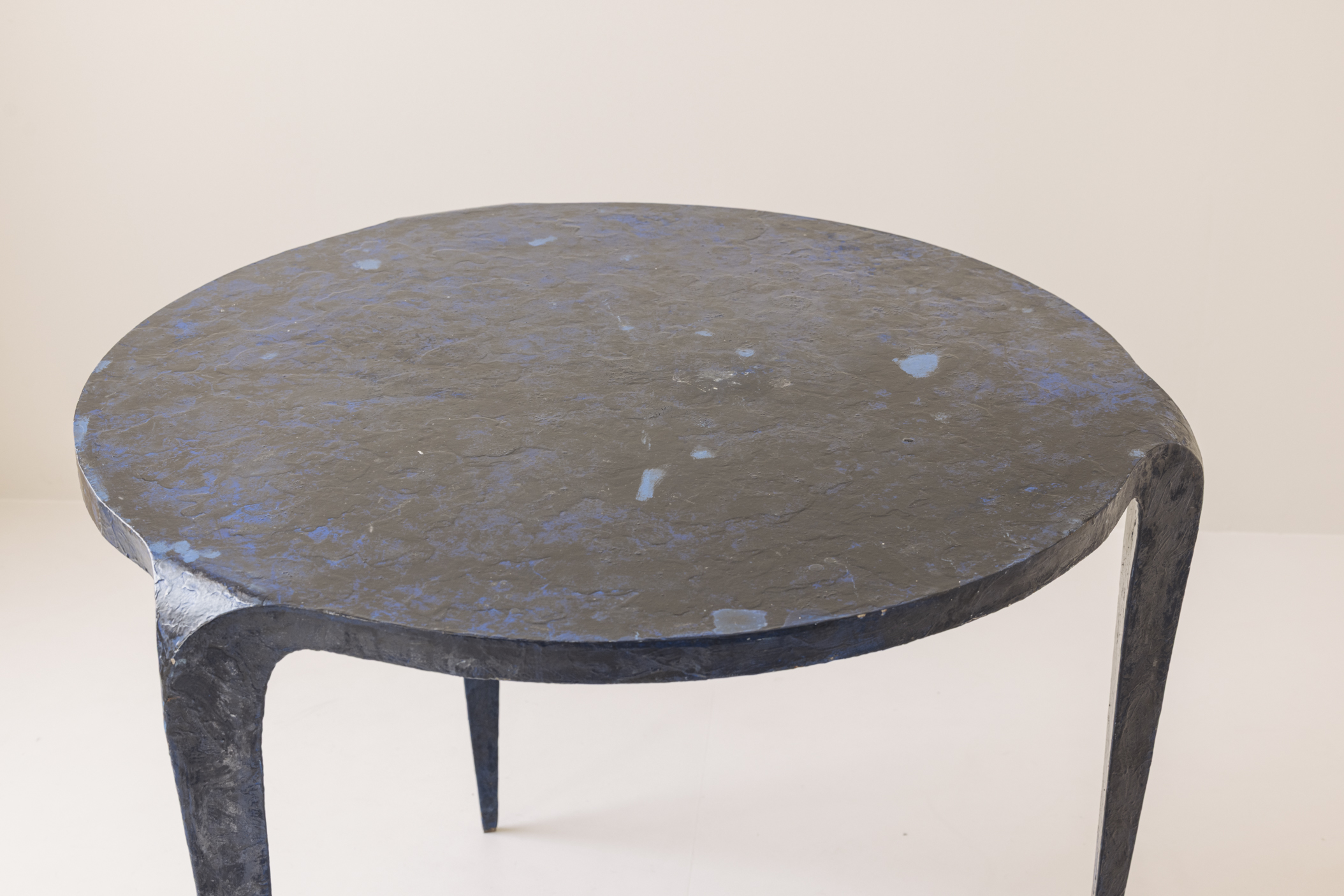 A true collector’s piece, this extraordinary tripod table from the 1980s is a one-off creation: sculptural, bold, and full of character. Cast in metal and finished in a richly textured, deep blue lacquer, the table reveals subtle tonal shifts from cobalt to midnight, giving the surface an almost painterly depth. Its most striking feature is the seamless form: the top and legs flow together in a single, fluid gesture, appearing as though carved from one solid mass. The sharp, tapered legs give it a graphic lightness, contrasting beautifully with the heavy materiality and tactile texture of the surface. This is not just a table, it’s a functional sculpture. The irregularities, the layered blues, the brutal yet elegant form—all speak to a singular creative vision. A rare and exceptional find, sourced with care and admiration.