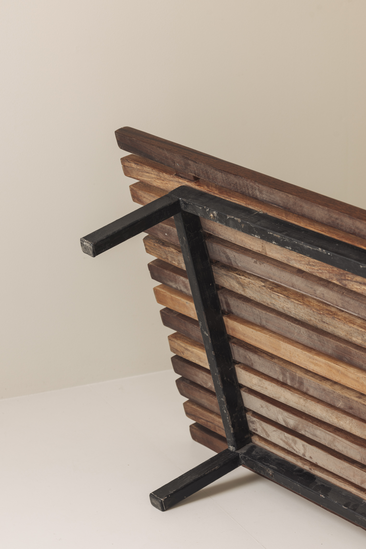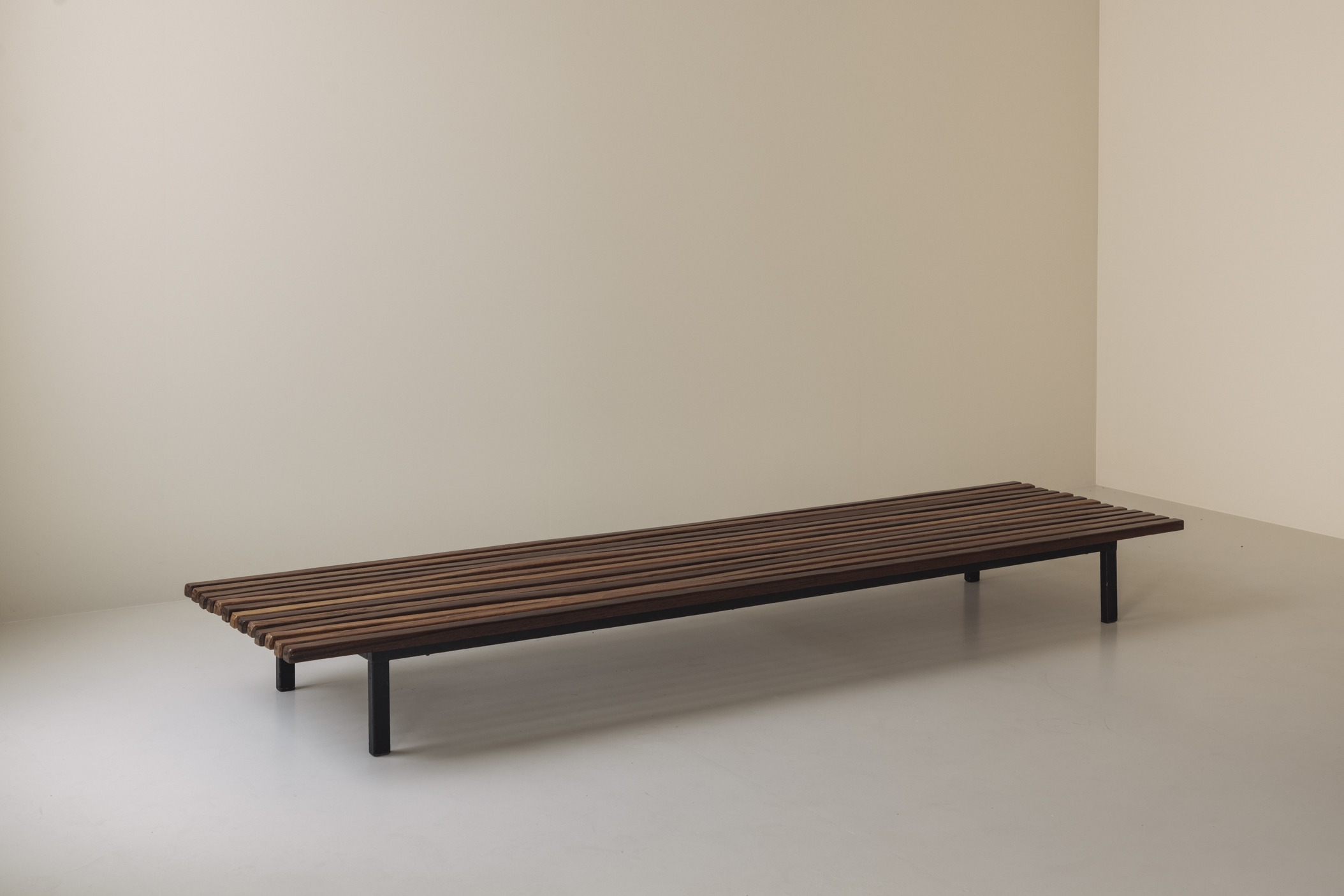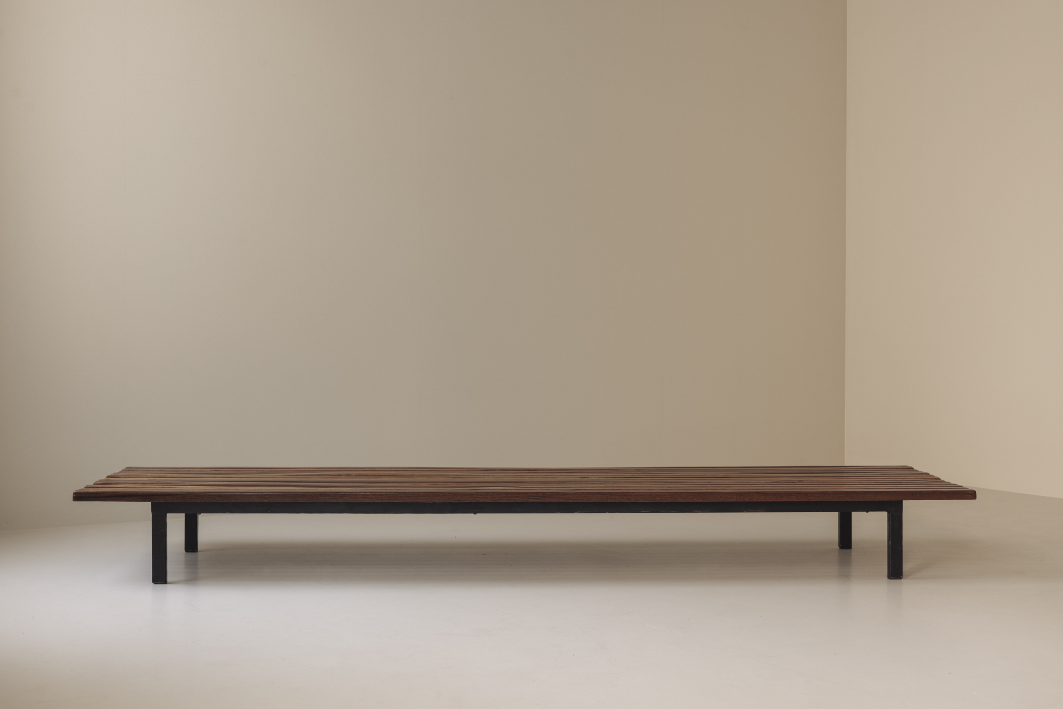 This rare “Cansado” bench was designed in 1958 by Charlotte Perriand as part of her commission for the newly built mining town of Cansado in Mauritania. Conceived for workers’ housing, the design embodies Perriand’s dedication to functional, honest furniture that could be produced with efficiency while maintaining architectural elegance. Executed in solid wood, the bench is defined by its clean lines and strong proportions, with a robust plank seat resting on block supports. The minimalist form reflects Perriand’s belief in essential design stripped of ornament, where materiality and function take precedence. Its warm, natural patina only enhances the timeless simplicity of the piece. A rare surviving example from this historic project, the Cansado bench represents Perriand’s ability to merge modernist ideals with human-centered design. Both utilitarian and sculptural, it is a collectible work that carries the spirit of mid-century design history into the present.