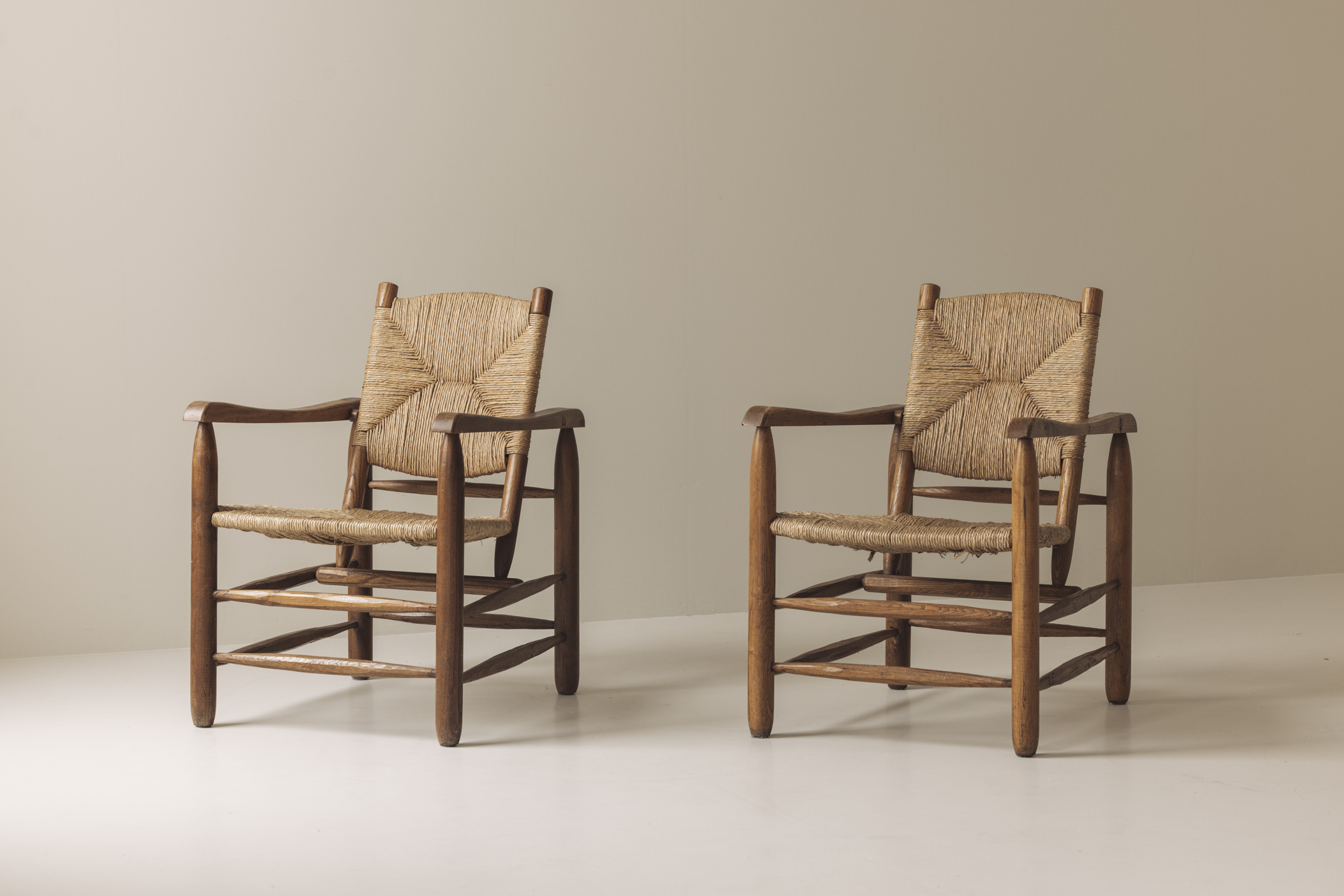 An exceptional and very rare pair of ‘Chamrousse’ armchairs, designed by Charlotte Perriand for Steph Simon in France during the 1940s. Made out from ash wood, these chairs feature handwoven straw seats and backs, embodying Perriand’s iconic balance of natural materials and modernist design. Presented in their original, untouched condition, the chairs retain a remarkable patina that speaks to their age and authenticity. This preservation of material and finish enhances their historical value, making them highly sought after by collectors and connoisseurs of 20th-century French design. A rare opportunity to acquire a true collector’s item, these armchairs exemplify Perriand’s vision of simplicity, functionality, and timeless elegance. The listed price is for the set of two pieces.