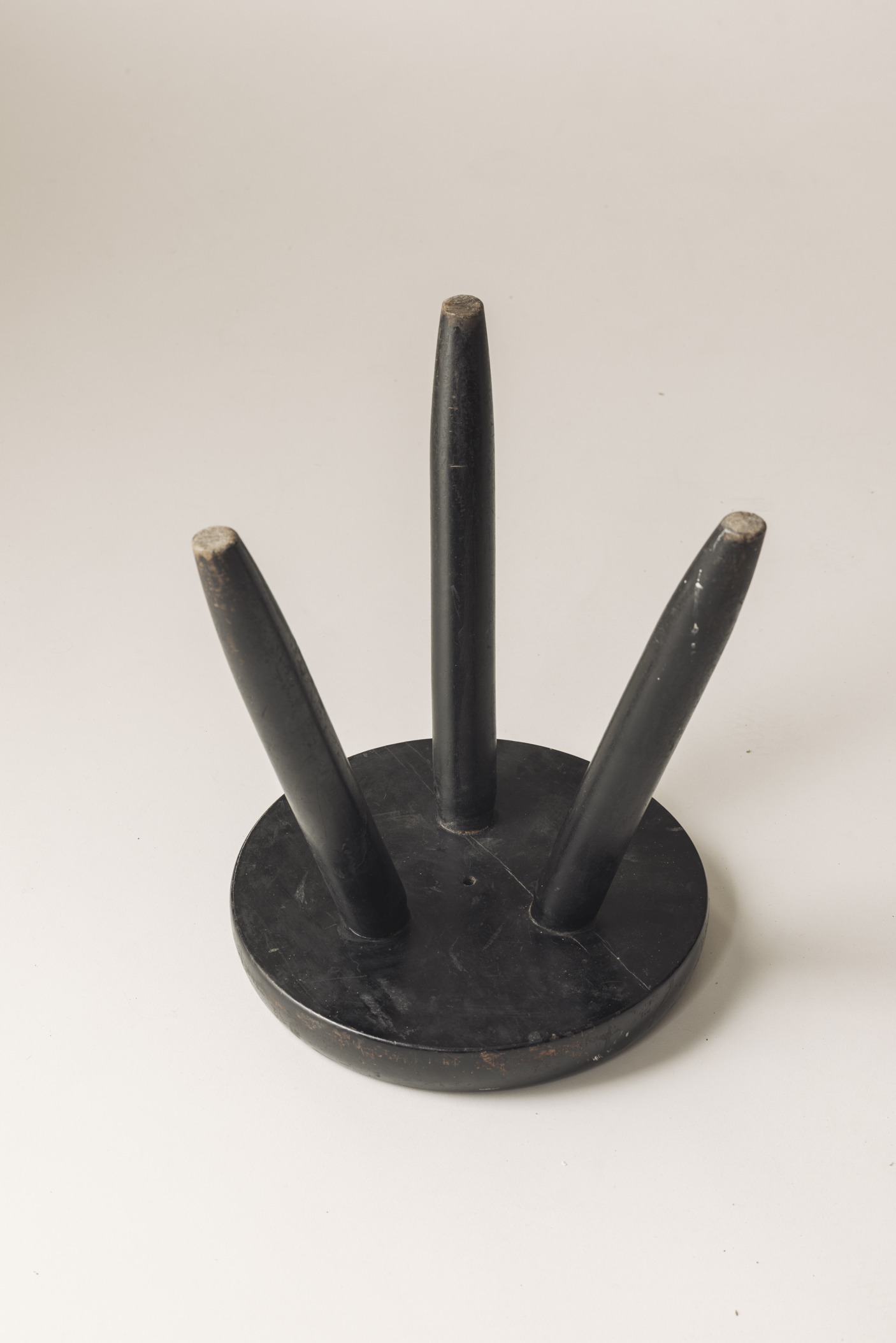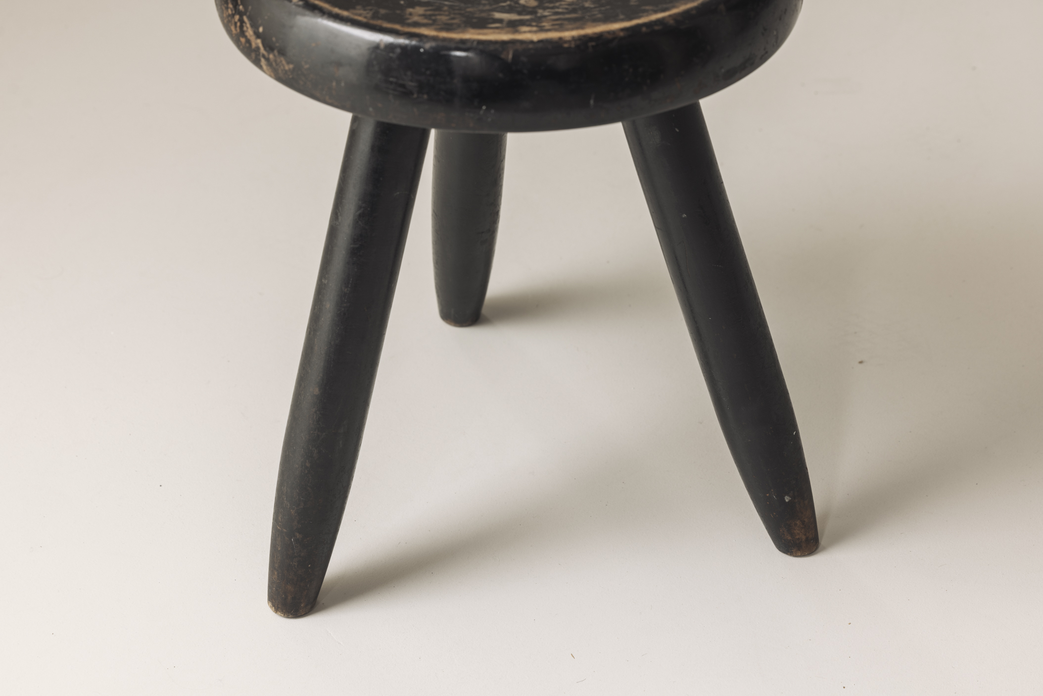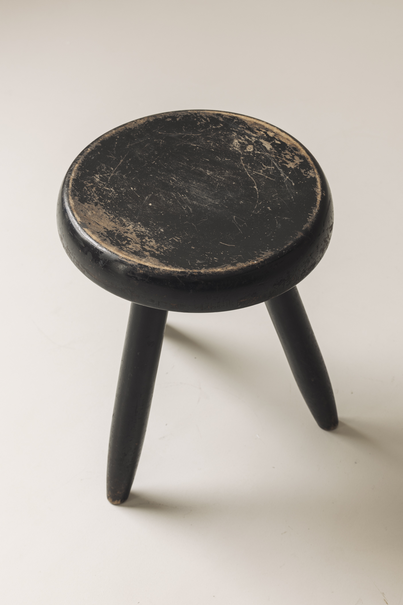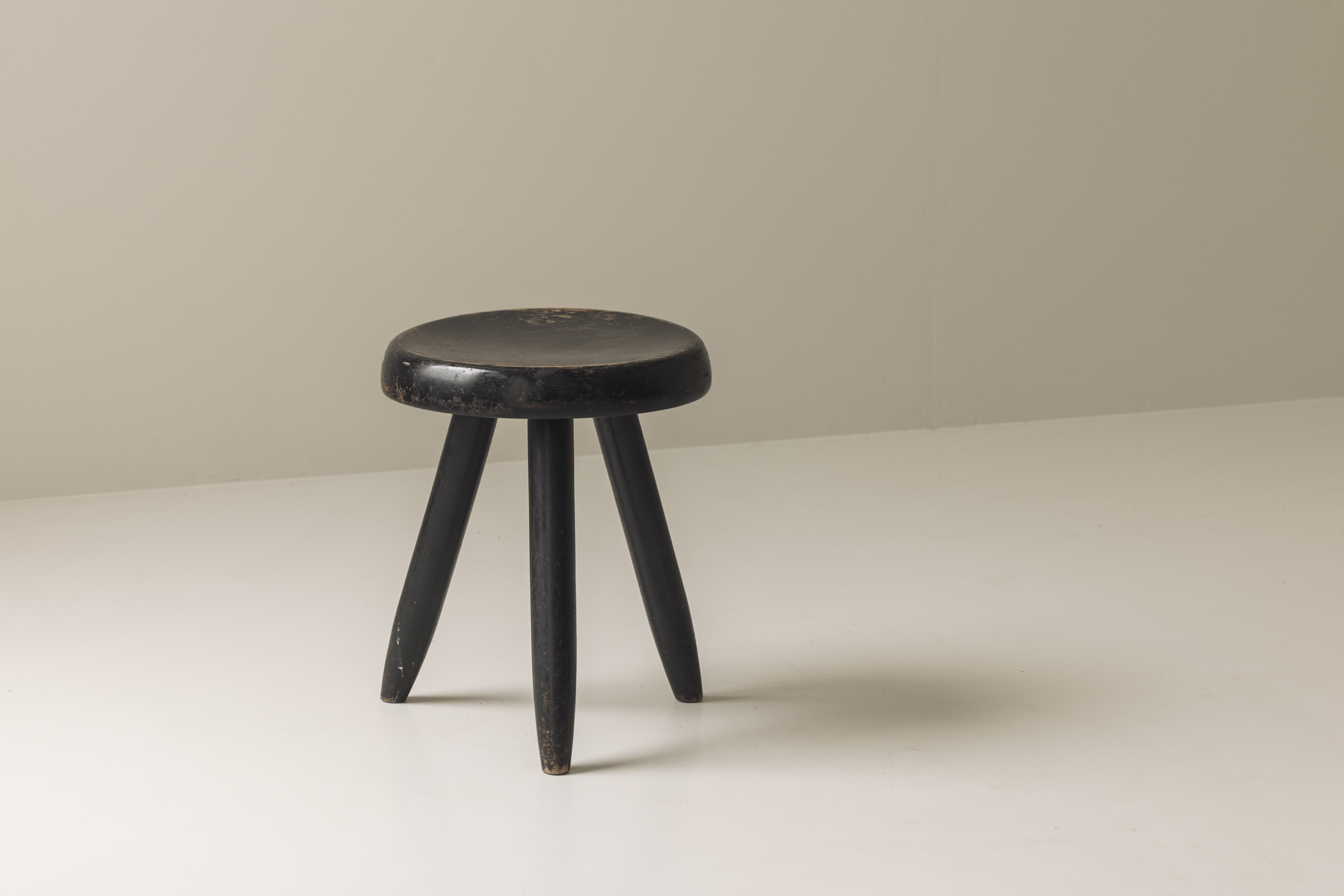 An exquisite example of mid-century French design, this early dark stained High Berger stool by Charlotte Perriand embodies the timeless simplicity and functional elegance that define her work. This piece dates from circa 1953 and has developed a warm, authentic patina over the decades, enhancing its natural charm and character. The Berger stool’s clean lines and honest use of materials reflect Perriand’s dedication to utilitarian beauty, while its modest scale and versatile form make it a perfect addition to both modern and traditional interiors. Whether used as a seat, a side table, or simply as a sculptural presence, this piece carries with it the quiet strength of design history. A rare opportunity to acquire an early Perriand design with exceptional originality and presence. Steph Simon edition.