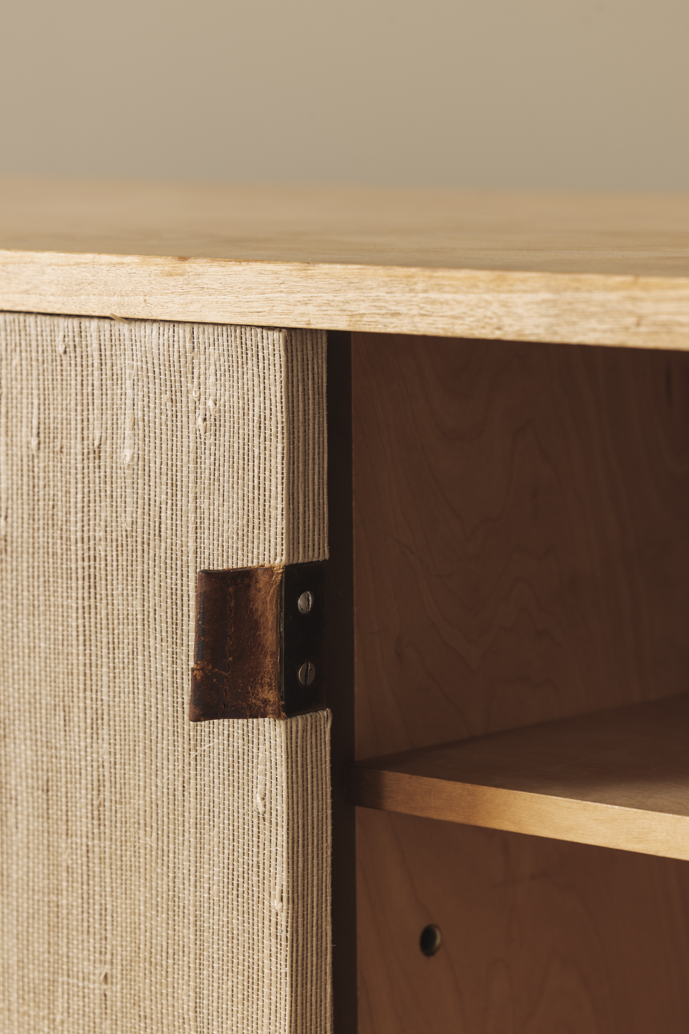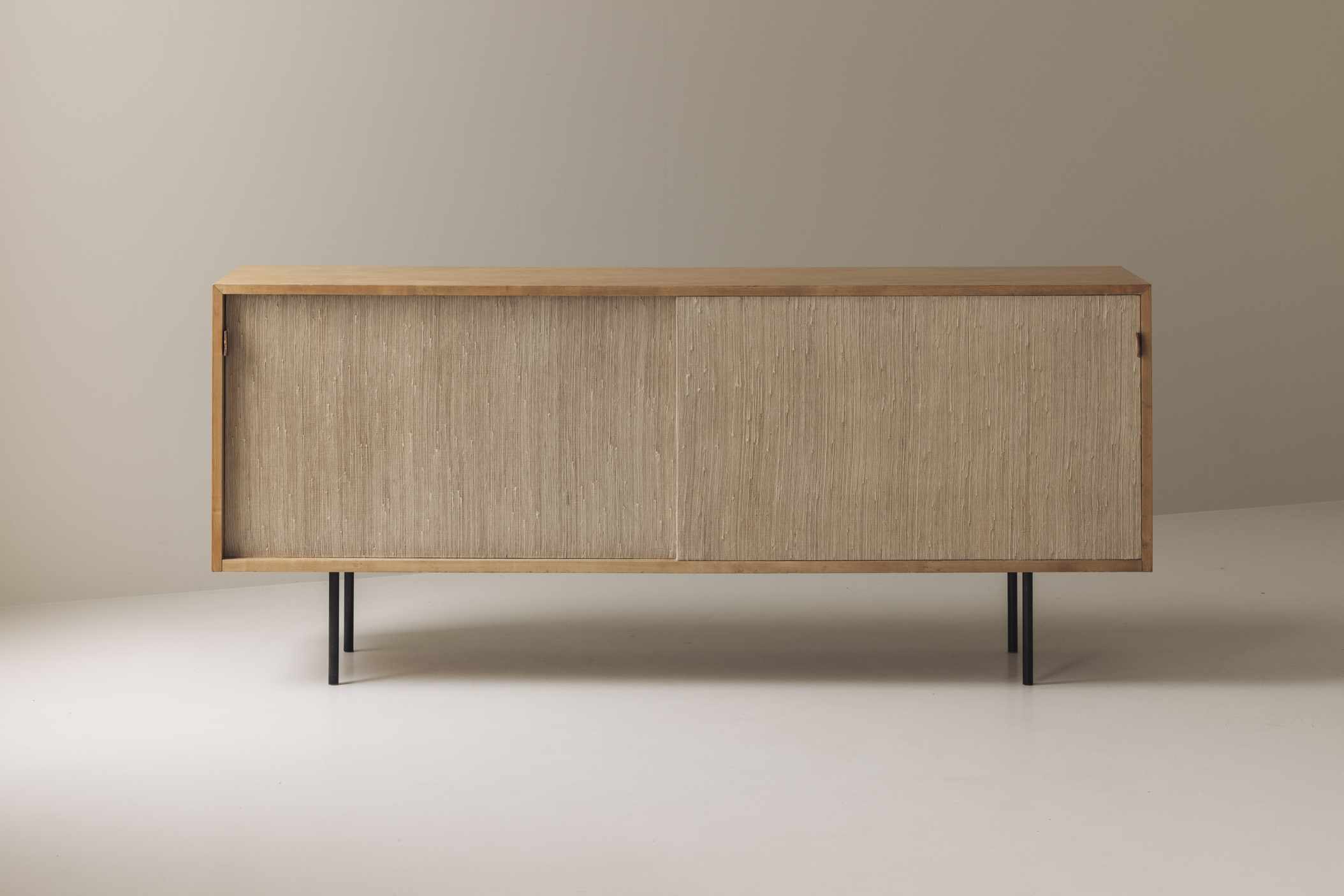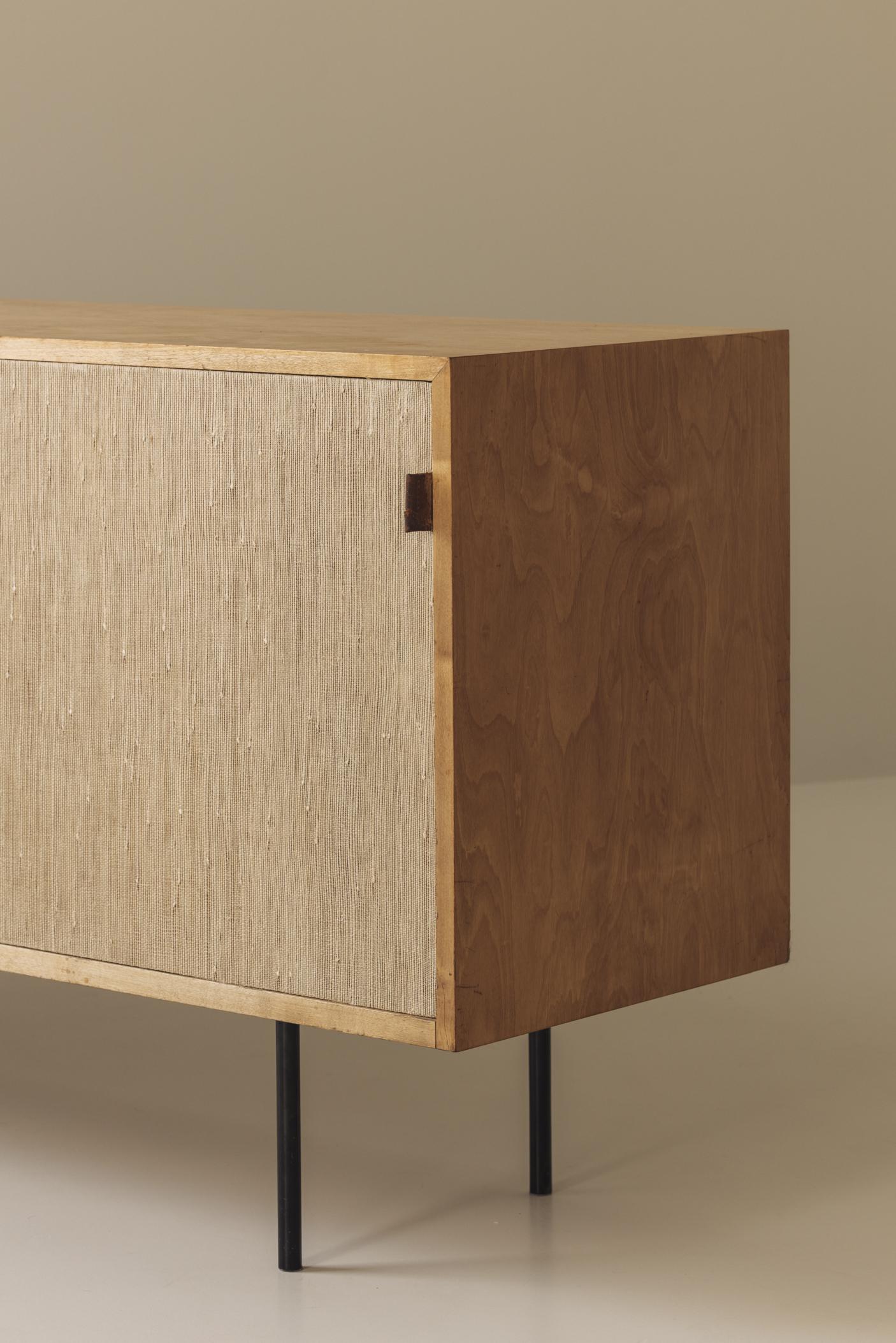 An exceptional example of mid-century modern design, this Model 116 sideboard was designed by Florence Knoll for Knoll International in the 1950s. Made out from rich honey colored wood, it features two elegant seagrass sliding doors adorned with patinated cognac leather handles, opening to reveal a beautifully preserved maple interior. With its warm patina, refined proportions, and original Knoll label inside, this piece is not only a functional storage solution but also a true collector’s item. A rare opportunity to own an authentic design classic from one of the most influential figures in modern furniture history. Restored with love.