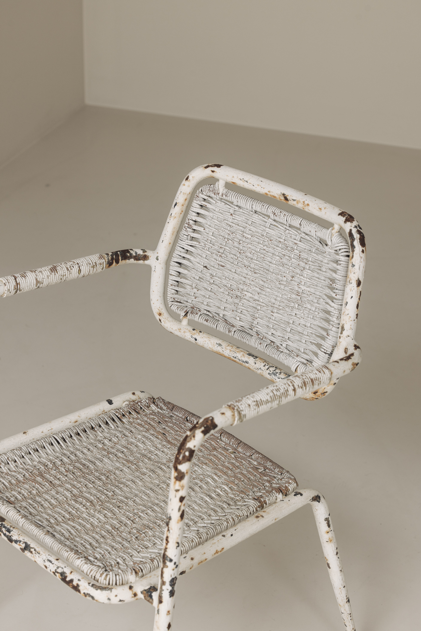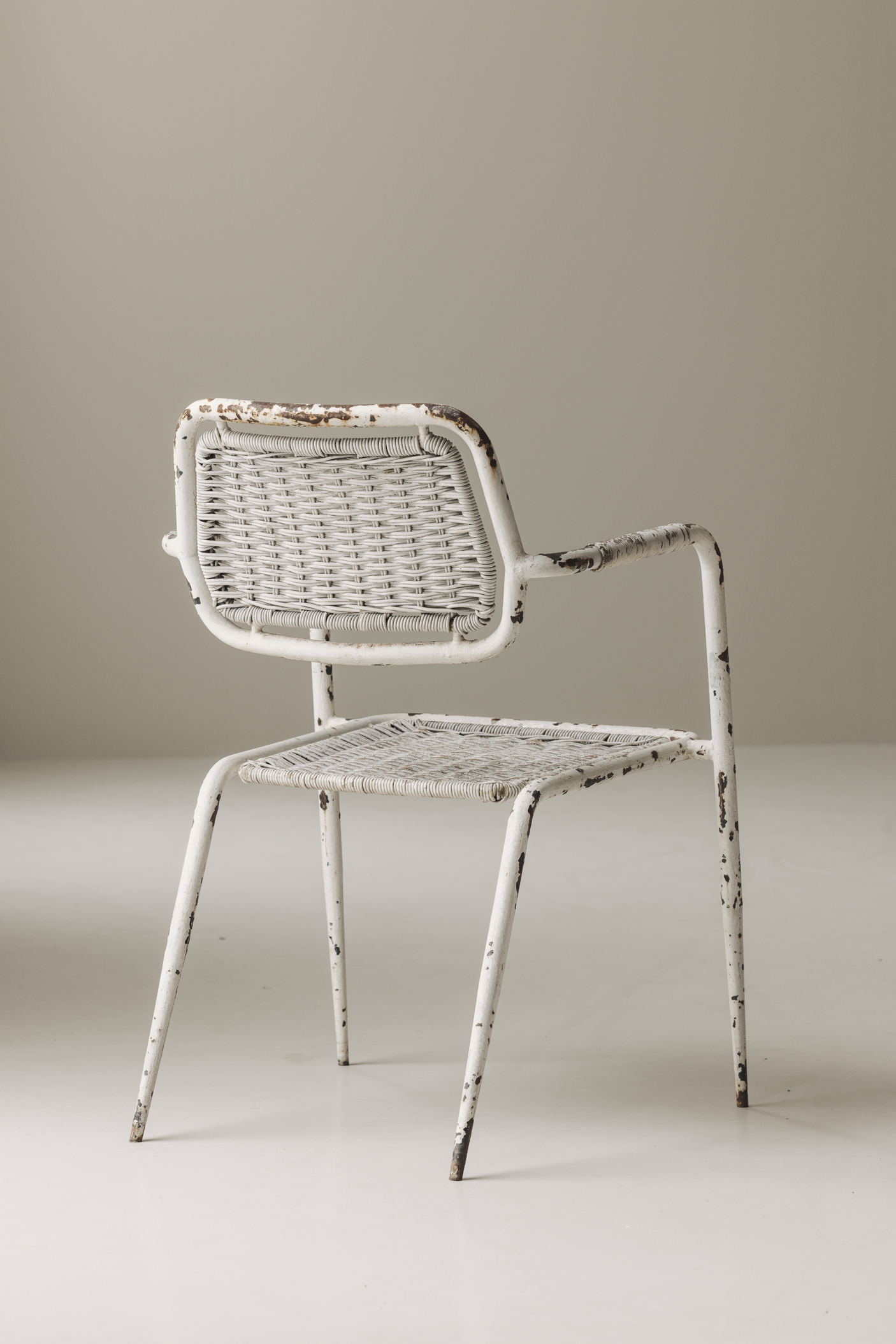 Raw, honest, and full of charm—this rare pair of 1950s French industrial armchairs brings the soul of the workshop into the refined interior. With tubular metal frames and woven synthetic wicker seats and backs, these chairs embody utilitarian design elevated by age and authenticity. The original white paint bears the marks of time—chipping, wear, and a gorgeous, lived-in patina that tells the story of decades past. Their simple, ergonomic lines and lightweight construction make them not only a visual statement but also a practical addition to any space. Perfect as accent chairs in a modern loft, a vintage-inspired dining area, or a creative studio, they bring an unmistakable industrial romance with a distinctly French twist.