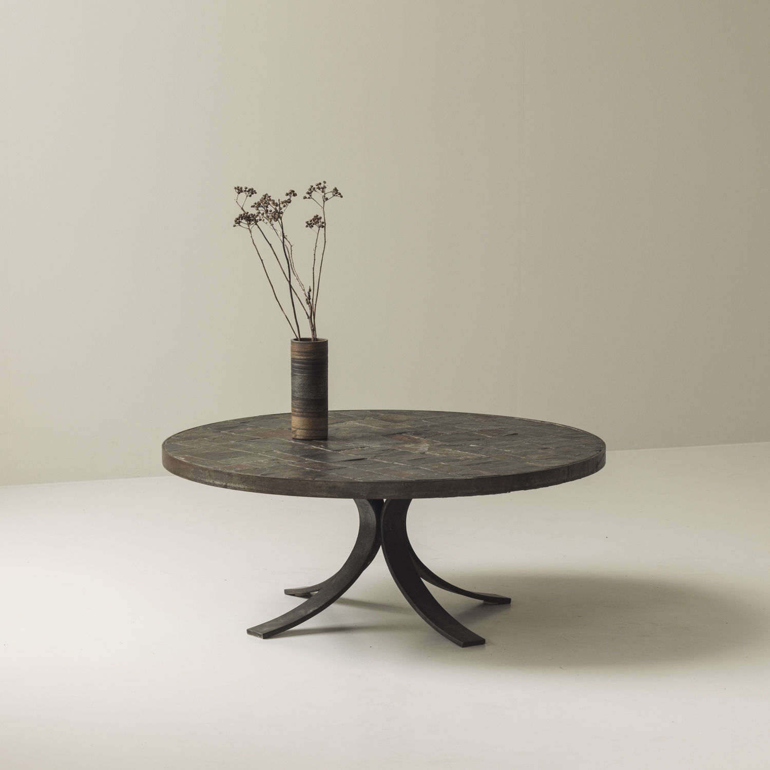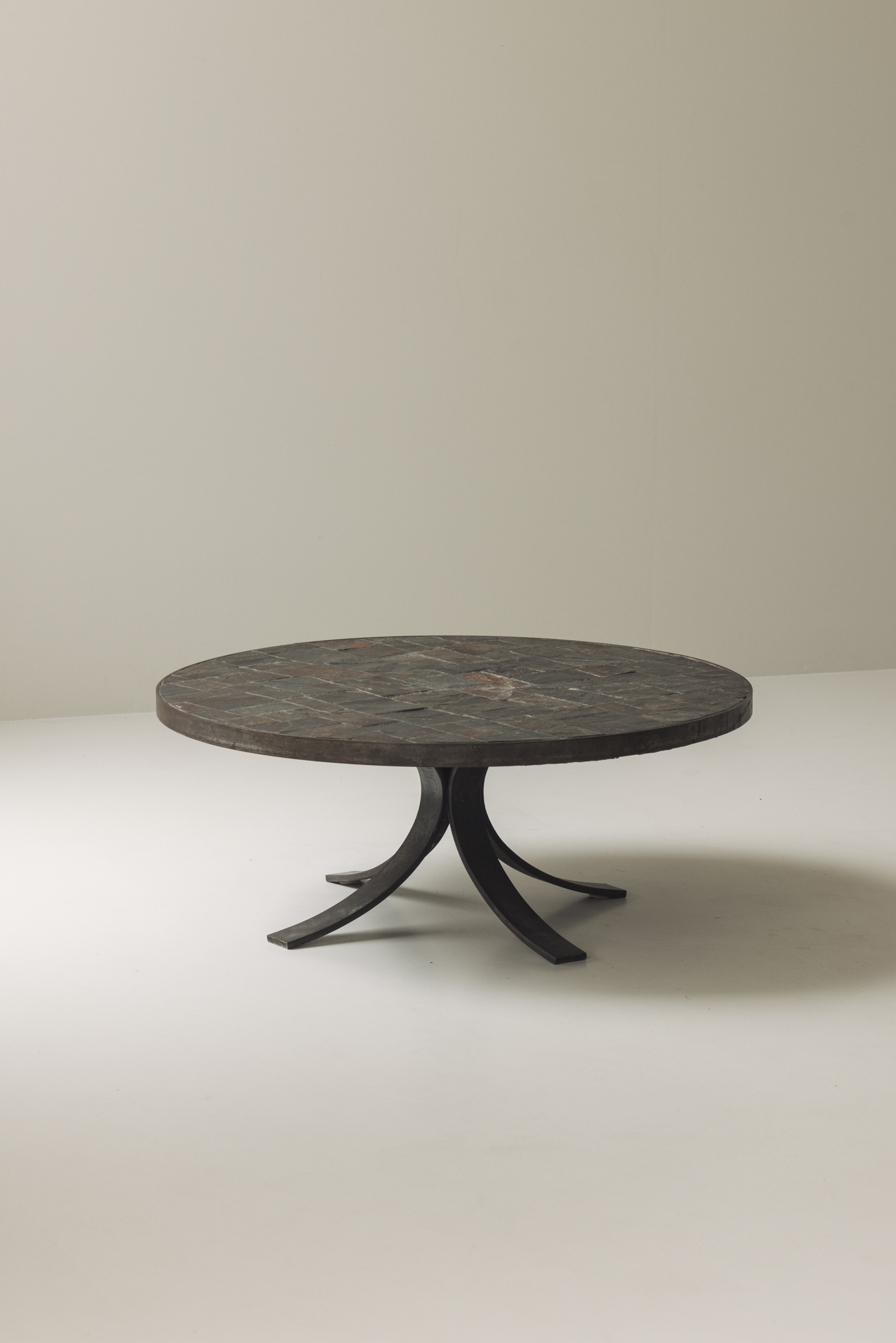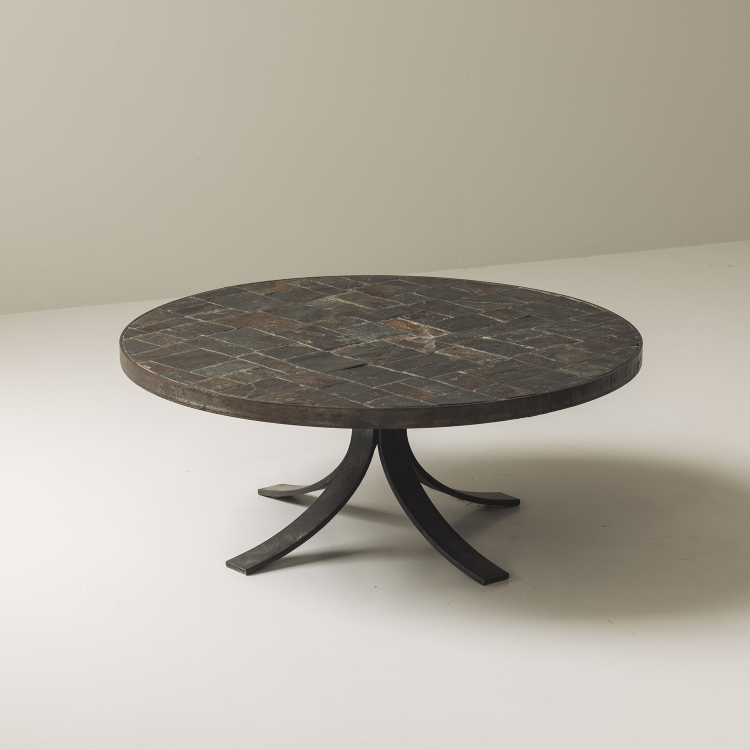 This elegant 1950s French coffee table combines raw materiality with refined design. The circular top, crafted from slate stone in a geometric inlay, showcases a natural palette of deep charcoals and earthy rust tones. Resting on a sculptural blackened metal base with arched legs, the table strikes a perfect balance between strength and grace. A true example of mid-century French design, it carries both architectural presence and understated sophistication—making it a versatile centerpiece for modern or classic interiors alike.