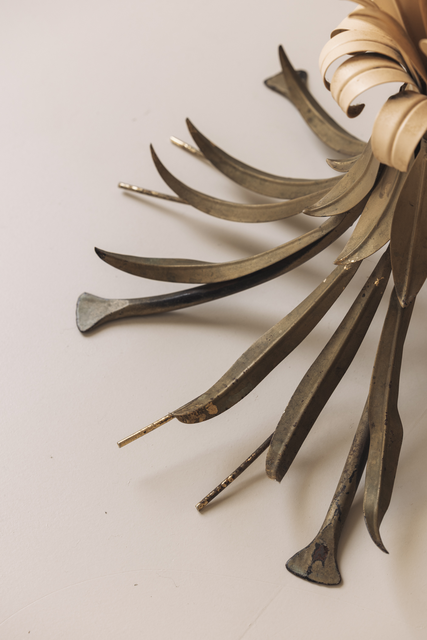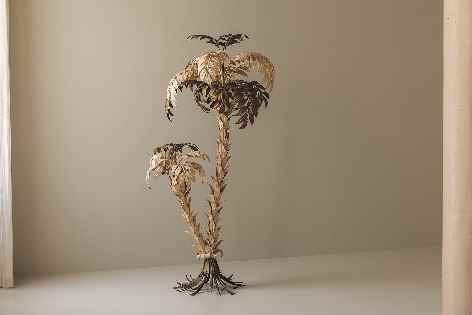 We are pleased to present a less common variation of the iconic Hans Kögl palm tree floor lamp, distinguished by its golden and cream painted leaves. Dating from the 1970s, this German-made sculptural lamp showcases Kögl’s signature craftsmanship in gilt metal, but with a softer, more nuanced palette that enhances its elegance. The twin palm design offers lush, detailed fronds and a graceful silhouette, making it a captivating statement piece whether lit or unlit. When illuminated, the warm glow plays beautifully against the gold and white tones, adding depth and sophistication to any interior — perfect for Hollywood Regency, mid-century modern, or eclectic spaces.