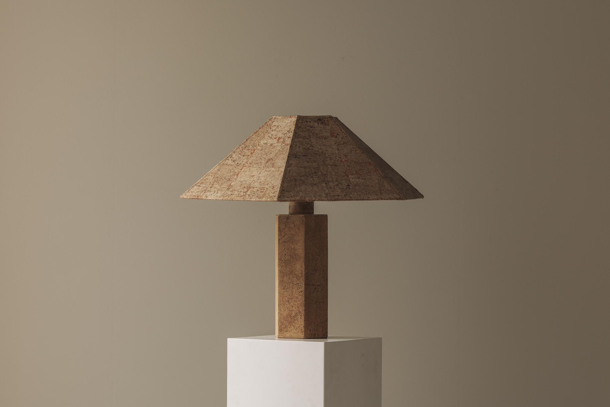 Discover this rare cork table lamp designed by Ingo Maurer for M Design, Germany 1970s. This sculptural table lamp is a striking example of Maurer’s early experimental work with natural materials. The lamp features a fully geometric hexagonal structure crafted entirely from natural cork, including both the base and the faceted shade. The warm organic surface is beautifully textured with natural pores and tonal variations, giving each lamp a unique character. The architectural form reflects Maurer’s fascination with simple geometry, material honesty, and atmospheric light. When illuminated, the cork softly diffuses the light, creating a warm ambient glow that enhances the natural richness of the material. This model is extremely rare and seldom seen on the market, particularly in this signed version. It represents an unusual and collectible piece from Maurer’s early design period before his later iconic lighting experiments. The underside of the lamp retains the original Design M manufacturer’s mark and signature, confirming authenticity. A remarkable statement piece for collectors of important 20th-century design, German modernism, and Ingo Maurer works.