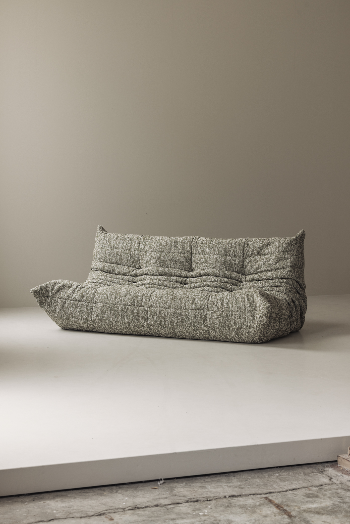 A true design classic, this Togo one-seater sofa was designed by Michel Ducaroy for Ligne Roset in the 1960s and remains one of the most recognizable pieces of 20th-century furniture design. Made out entirely from foam for exceptional comfort and a relaxed silhouette, this one is freshly re-upholstered in a lovely high quality fabric. A rare find for collectors and design enthusiasts alike. Perfect as a statement piece or a cozy addition to a reading nook, this three-seater captures the essence of modernist French design.