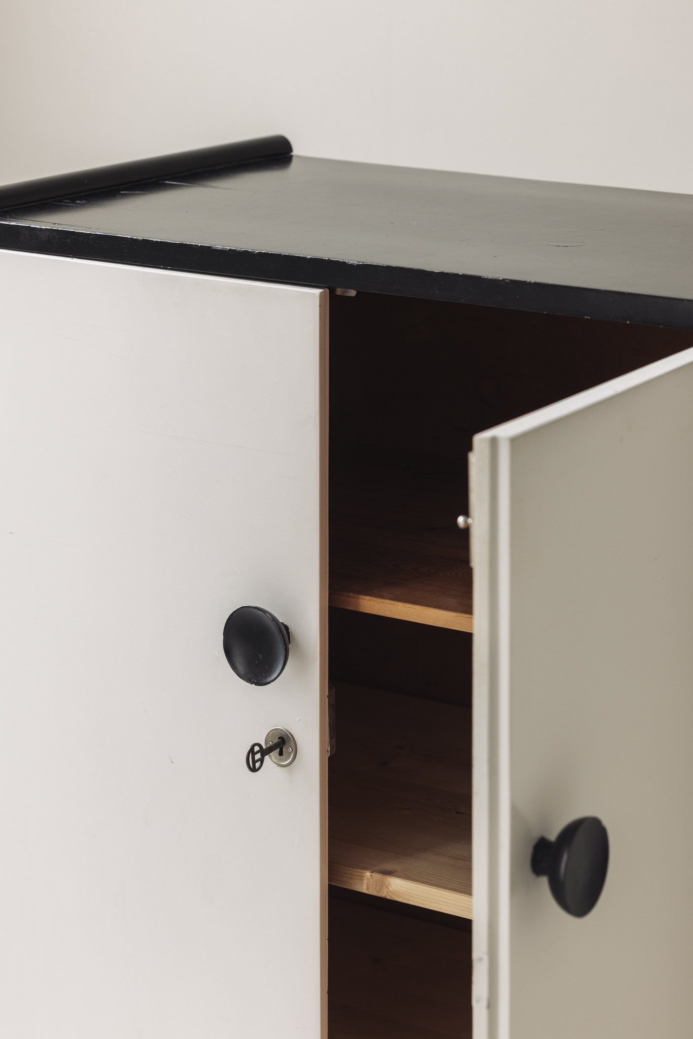 Discover this exquisite French cabinet from the 1940s, blending timeless elegance with functional design. Featuring a sleek black lacquered frame with raised edges and striking off-white lacquered doors, this piece offers ample storage space within. Retaining its original keys and presented in its untouched, authentic condition, it carries a patina of age that only enhances its charm. A truly captivating and stylish addition to any collection.