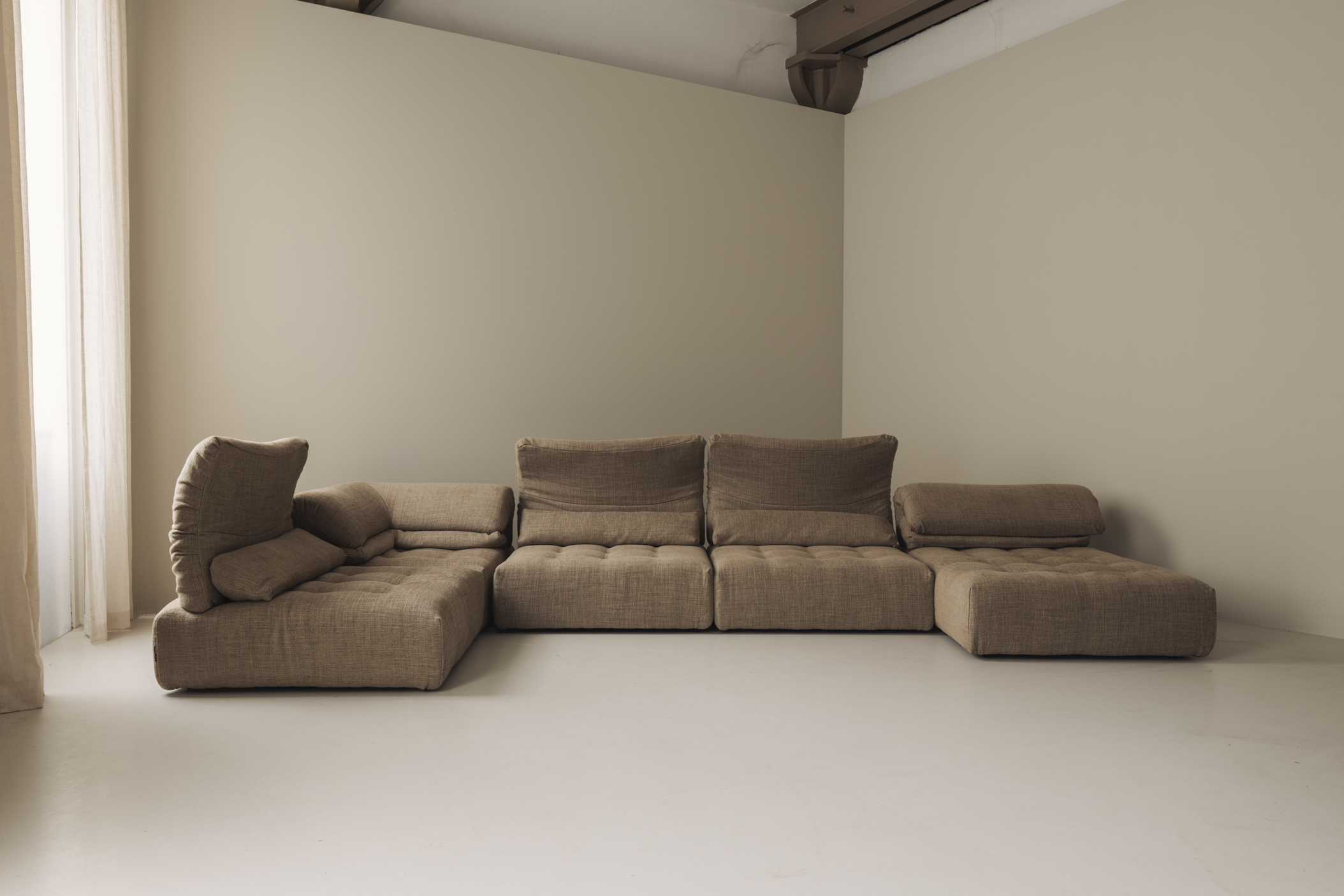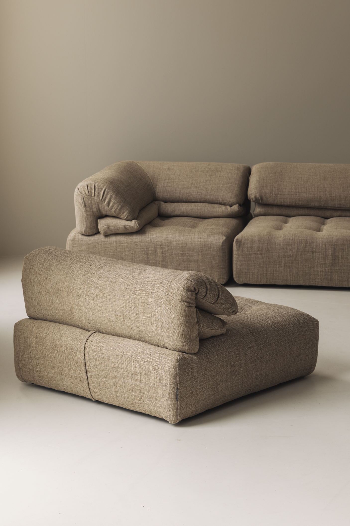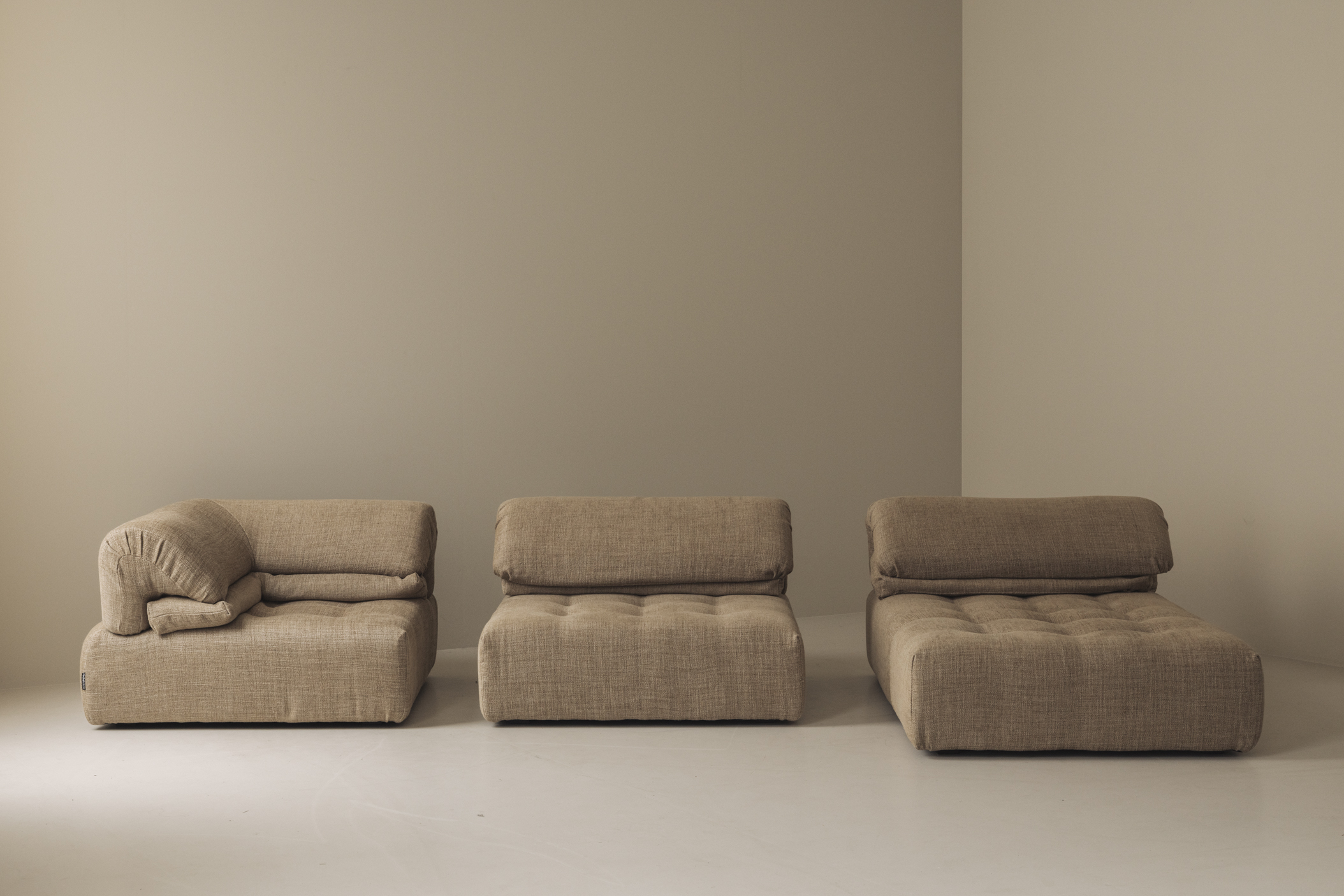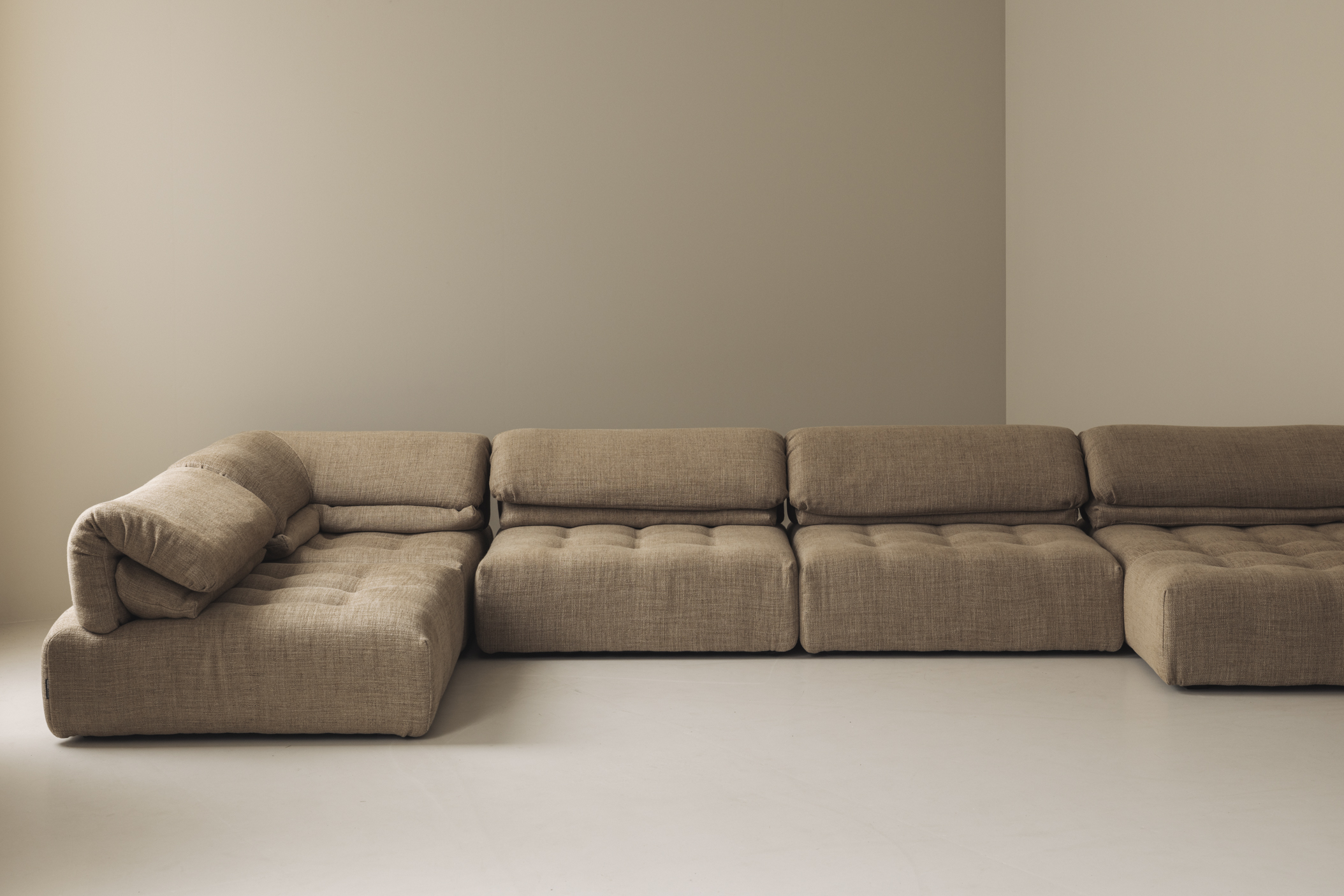 Exceptional modular “Voyage Immobile” sofa by Roche Bobois, designed by Studio Roche Bobois in the 1990s and manufactured in France. This striking composition consists of five individual elements: one corner unit, three lounge modules, and one ottoman, offering a highly versatile system that can be arranged in countless configurations. Its modular nature allows it to adapt effortlessly to a variety of spaces, from intimate seating arrangements to expansive, architectural layouts. Recently reupholstered by our skilled craftsmen, the sofa is finished in a refined high-quality linen blend fabric. This choice of material enhances both comfort and durability while giving the piece a soft, tactile elegance that complements its bold, sculptural presence. Clearly labeled, confirming its authenticity, this piece reflects the relaxed luxury and innovative spirit of 1990s French design. With its generous proportions and inviting, low-slung form, the “Voyage Immobile” is both a statement piece and a highly adaptable seating solution for contemporary interiors.