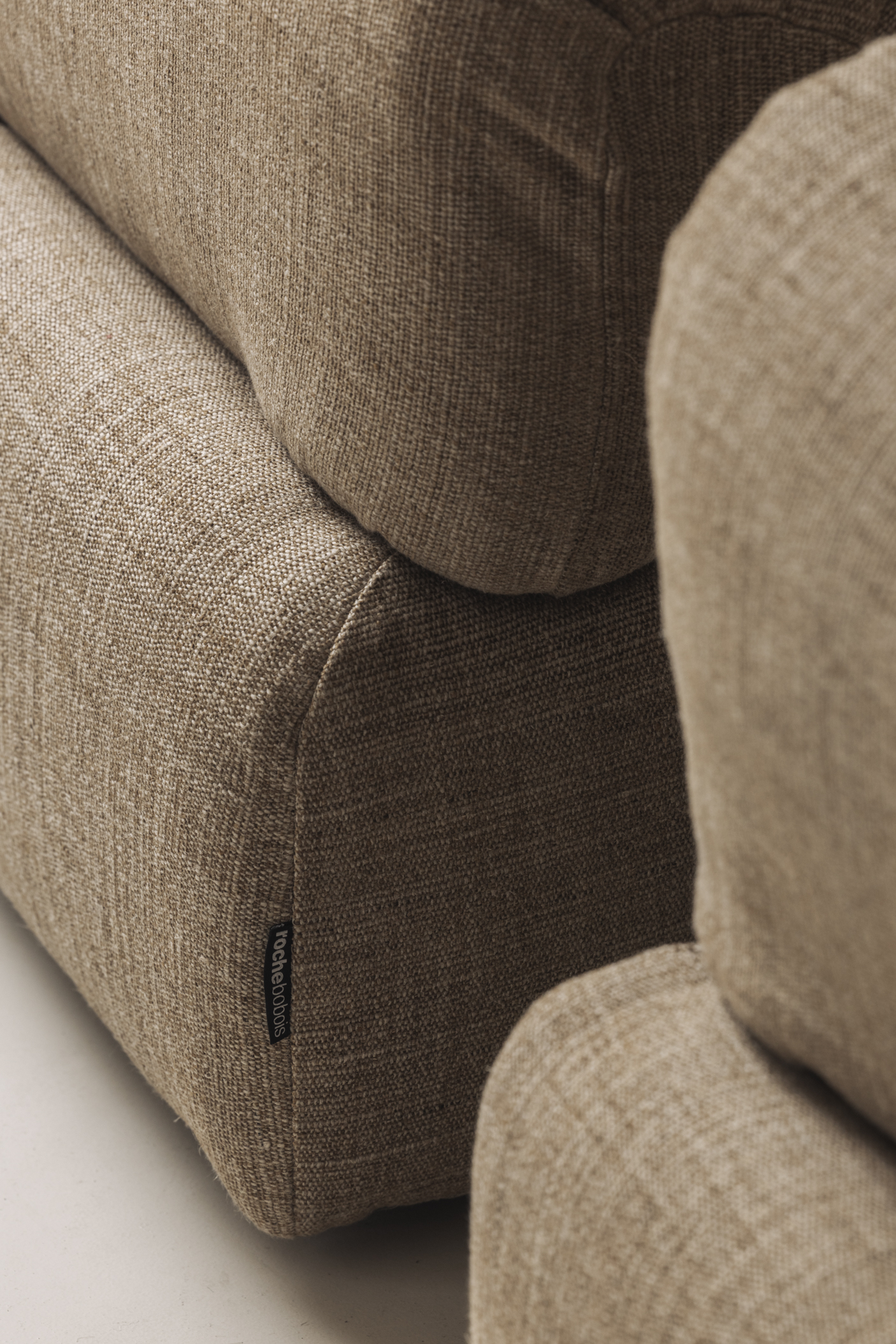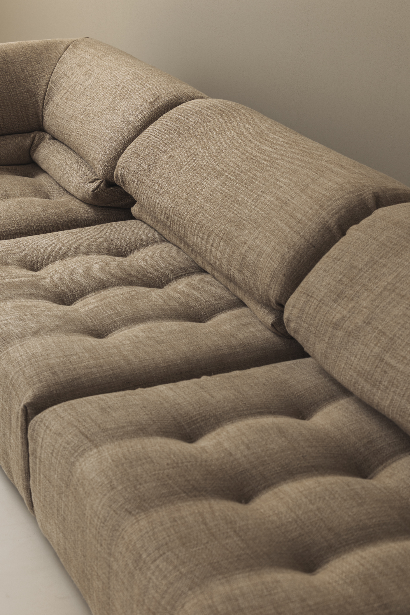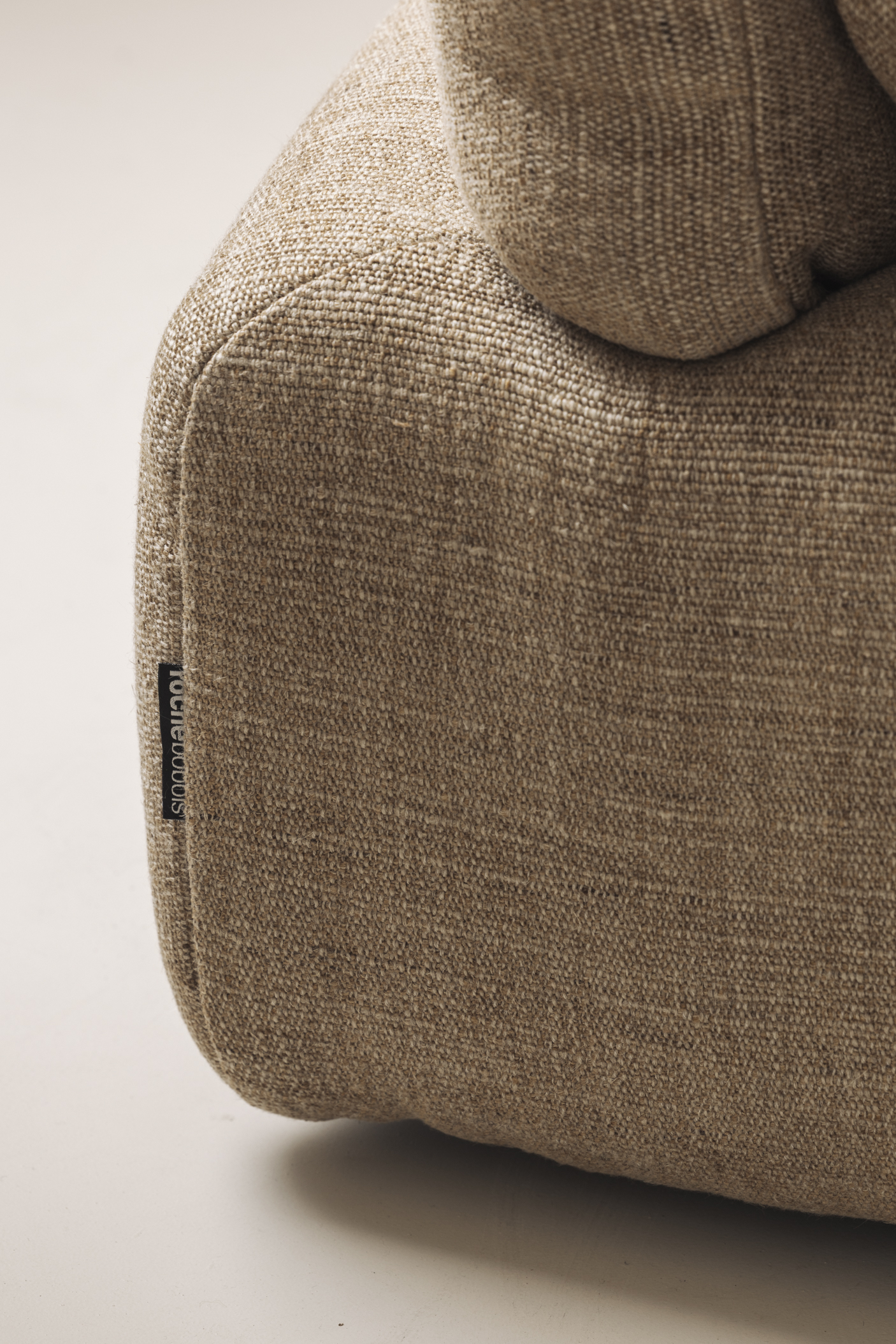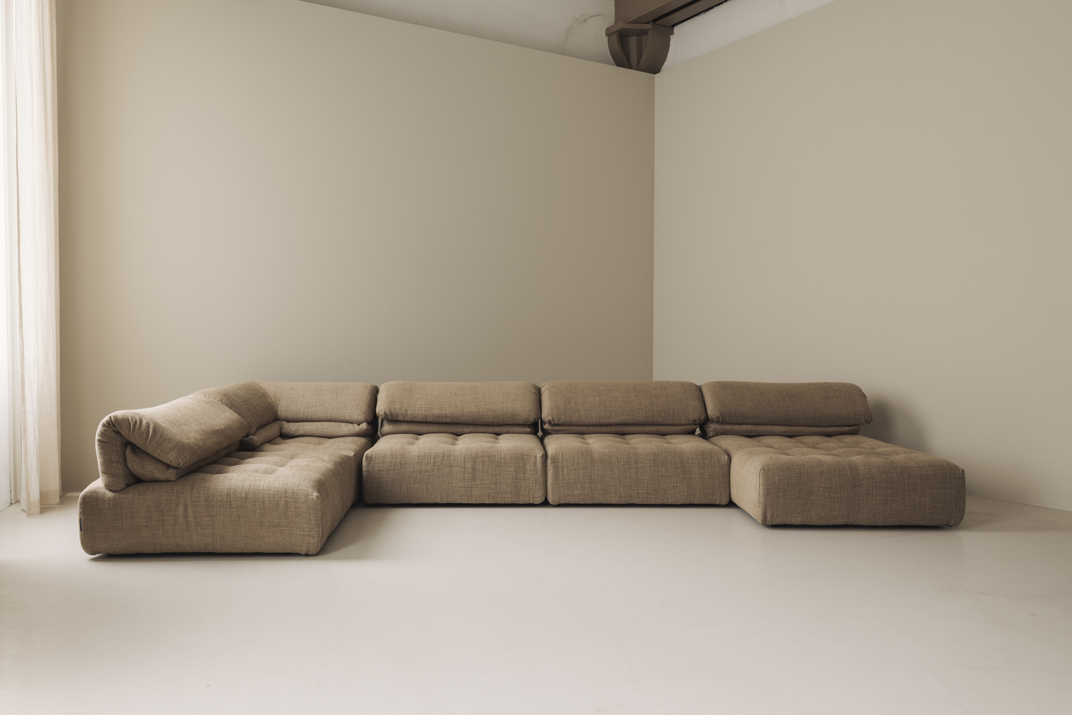 Exceptional modular “Voyage Immobile” sofa by Roche Bobois, designed by Studio Roche Bobois in the 1990s and manufactured in France. This striking composition consists of five individual elements: one corner unit, three lounge modules, and one ottoman, offering a highly versatile system that can be arranged in countless configurations. Its modular nature allows it to adapt effortlessly to a variety of spaces, from intimate seating arrangements to expansive, architectural layouts. Recently reupholstered by our skilled craftsmen, the sofa is finished in a refined high-quality linen blend fabric. This choice of material enhances both comfort and durability while giving the piece a soft, tactile elegance that complements its bold, sculptural presence. Clearly labeled, confirming its authenticity, this piece reflects the relaxed luxury and innovative spirit of 1990s French design. With its generous proportions and inviting, low-slung form, the “Voyage Immobile” is both a statement piece and a highly adaptable seating solution for contemporary interiors.