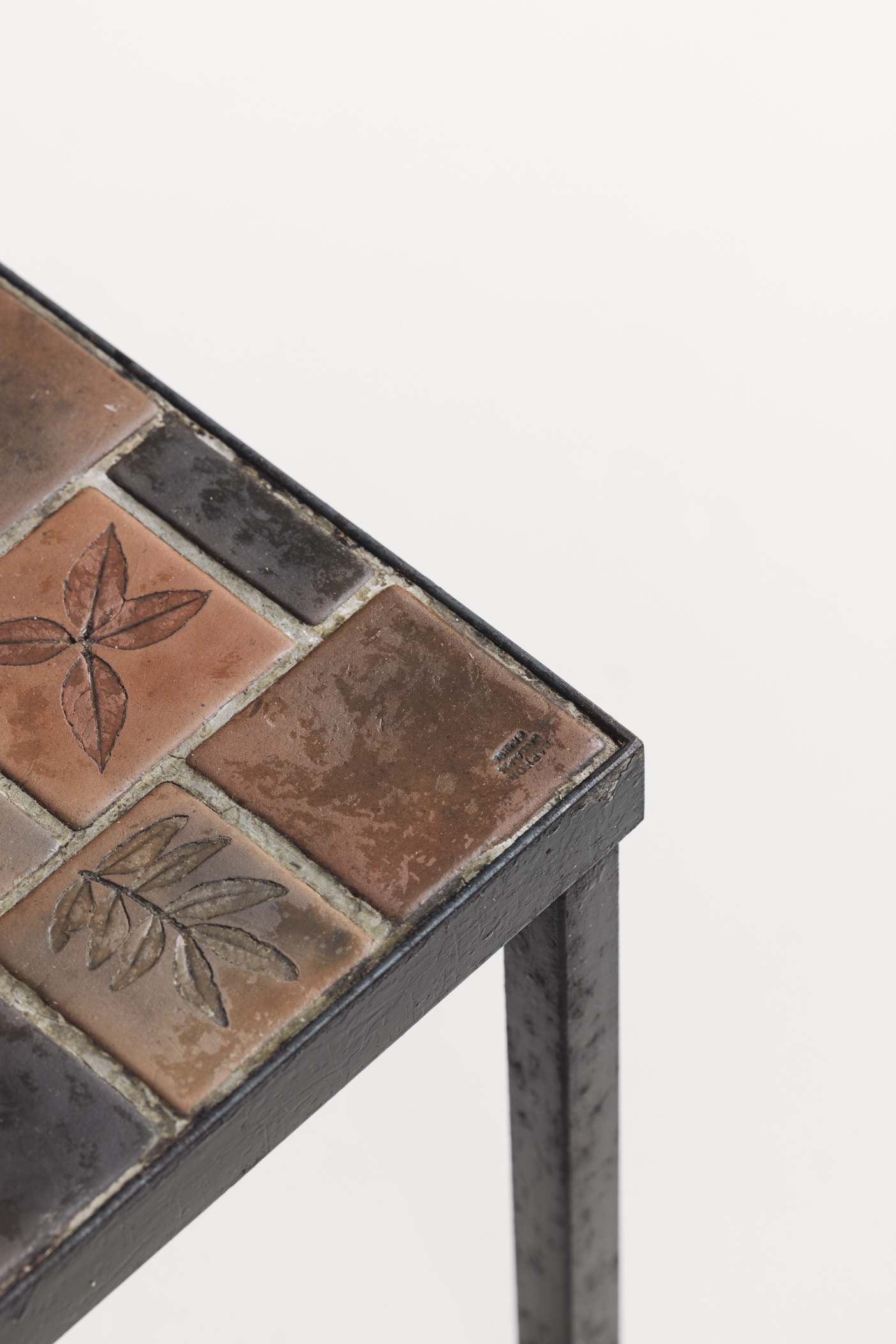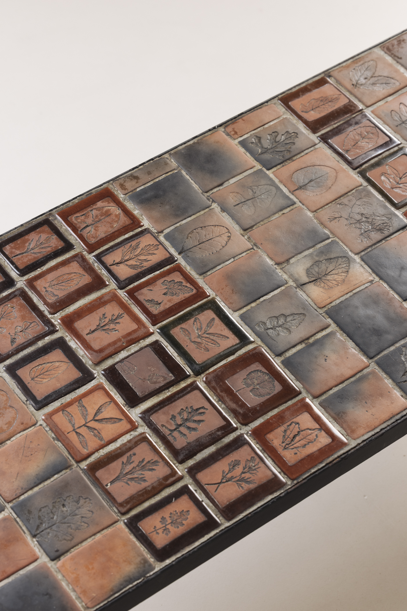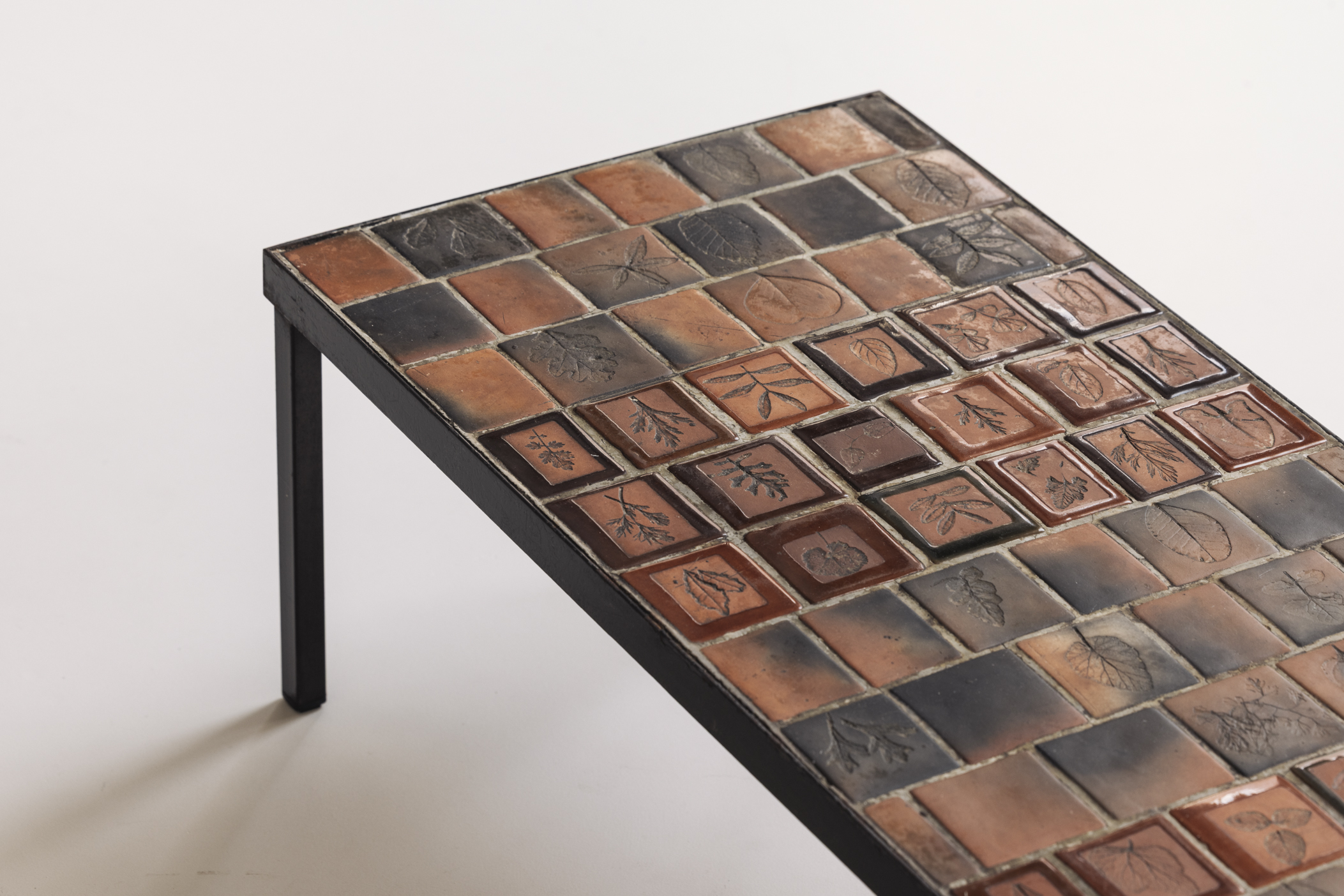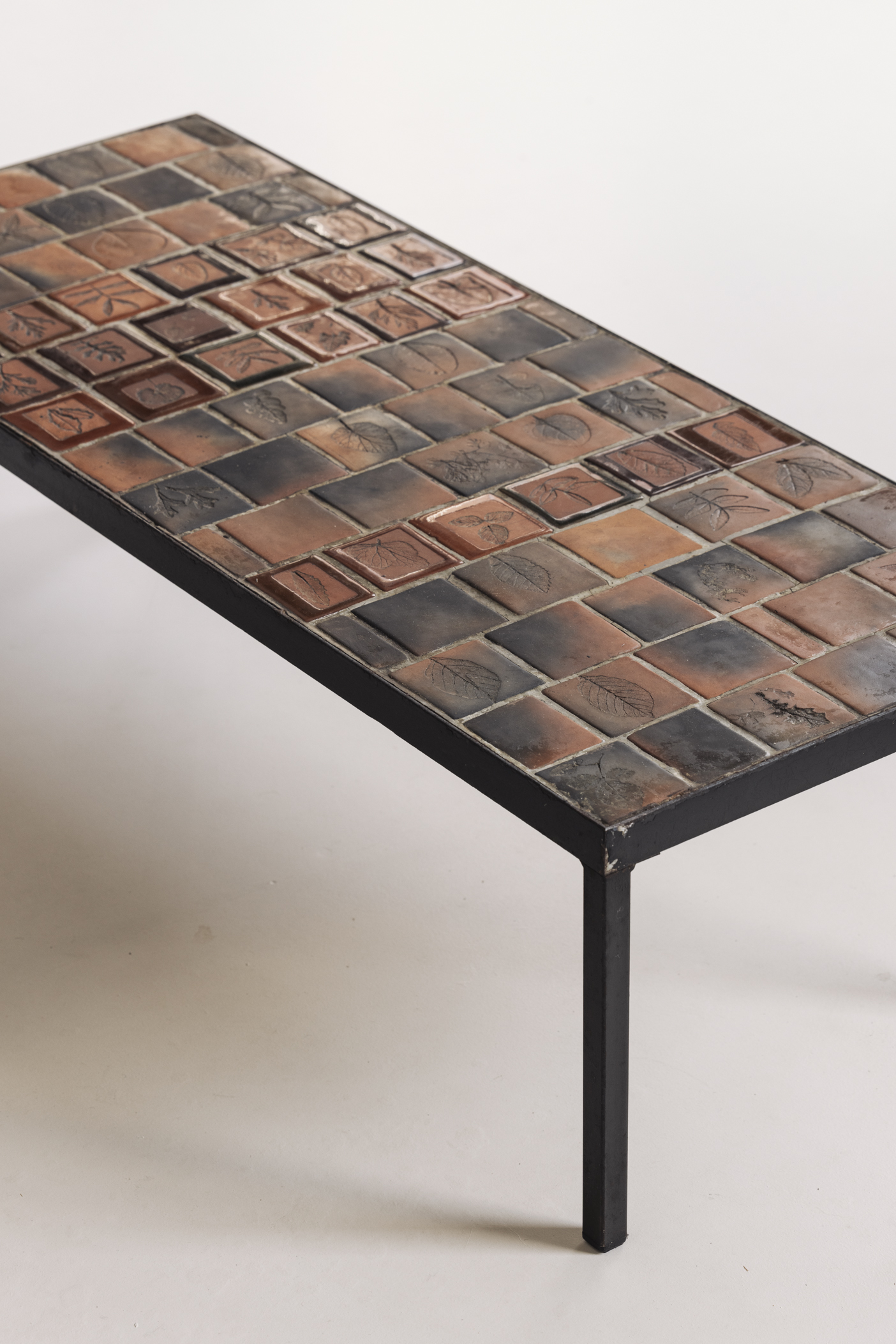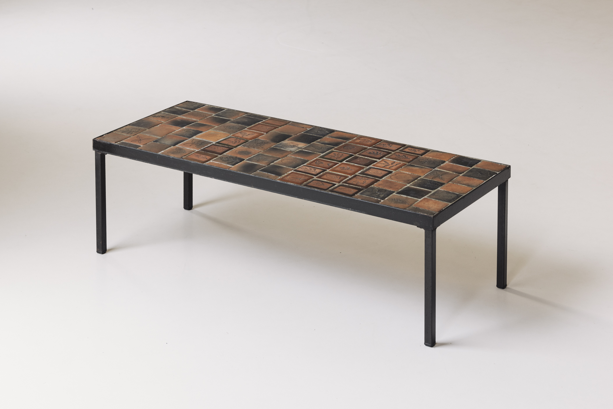 Early edition Herbarium rectangular coffee table by Roger Capron, France 1960s. This piece features a steel frame and a tabletop adorned with glazed ceramic tiles, each carefully decorated with botanical motifs. Presented in its original condition with visible signs from age and use. Labeled on top.