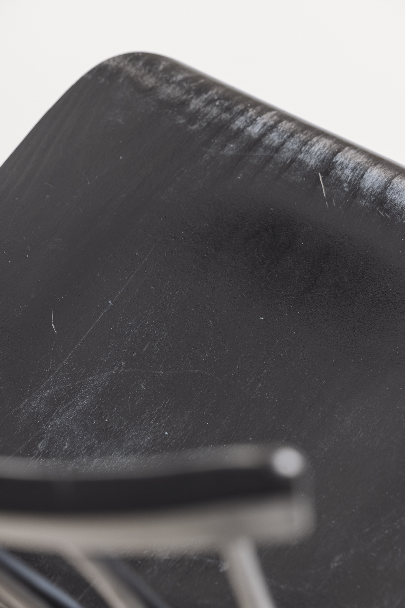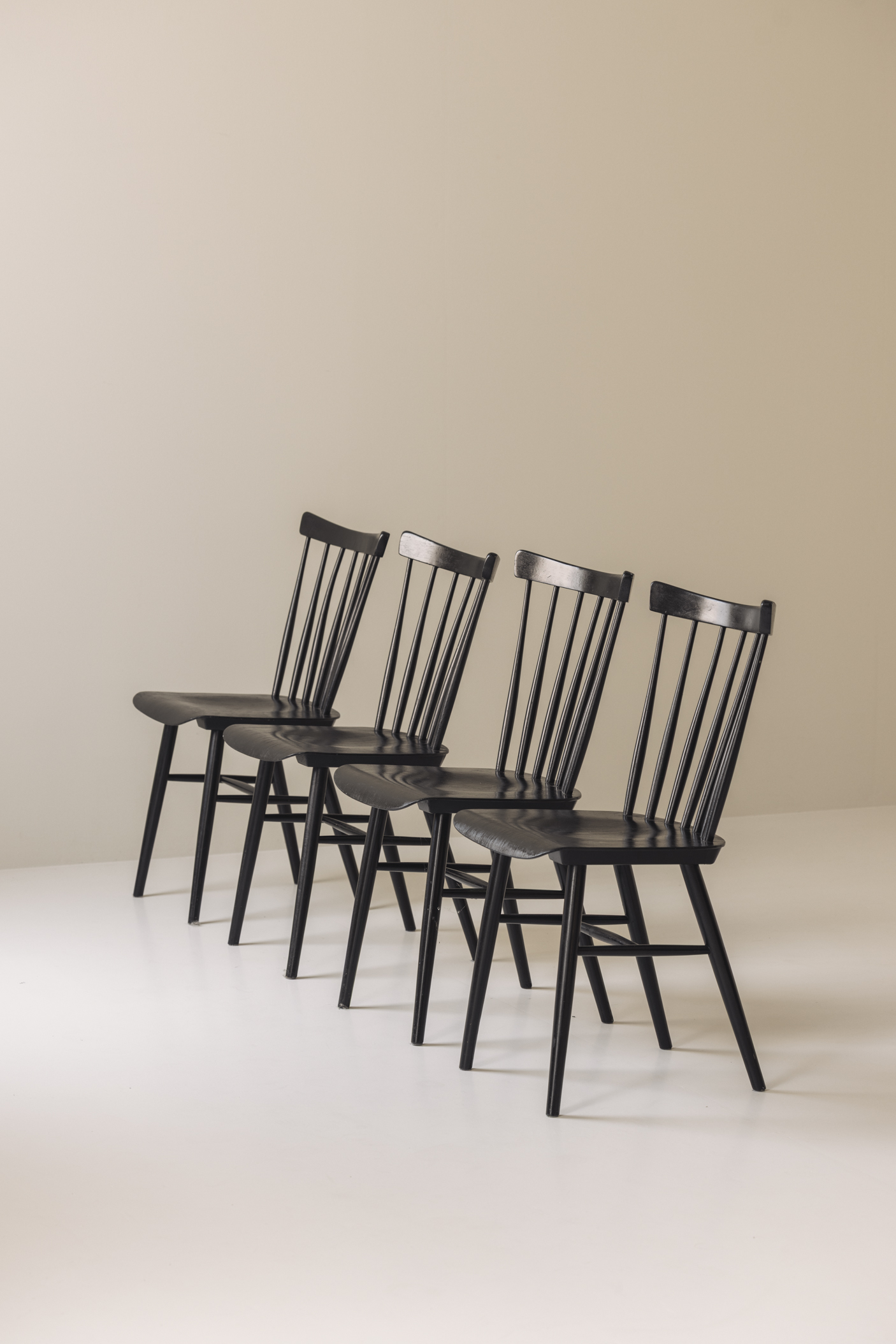 Set of four black spindle-back chairs from the 1960s. Made out of wood and finished in a deep, velvety black, these chairs embody the sleek, understated beauty of mid-century design. The gently curved backrest and slim vertical spindles combine visual charm with practical design. Whether placed around a dining table, in a cozy reading nook, or as accent seating, these chairs are versatile enough to complement both contemporary and vintage interiors. The listed price is for the set of four pieces.