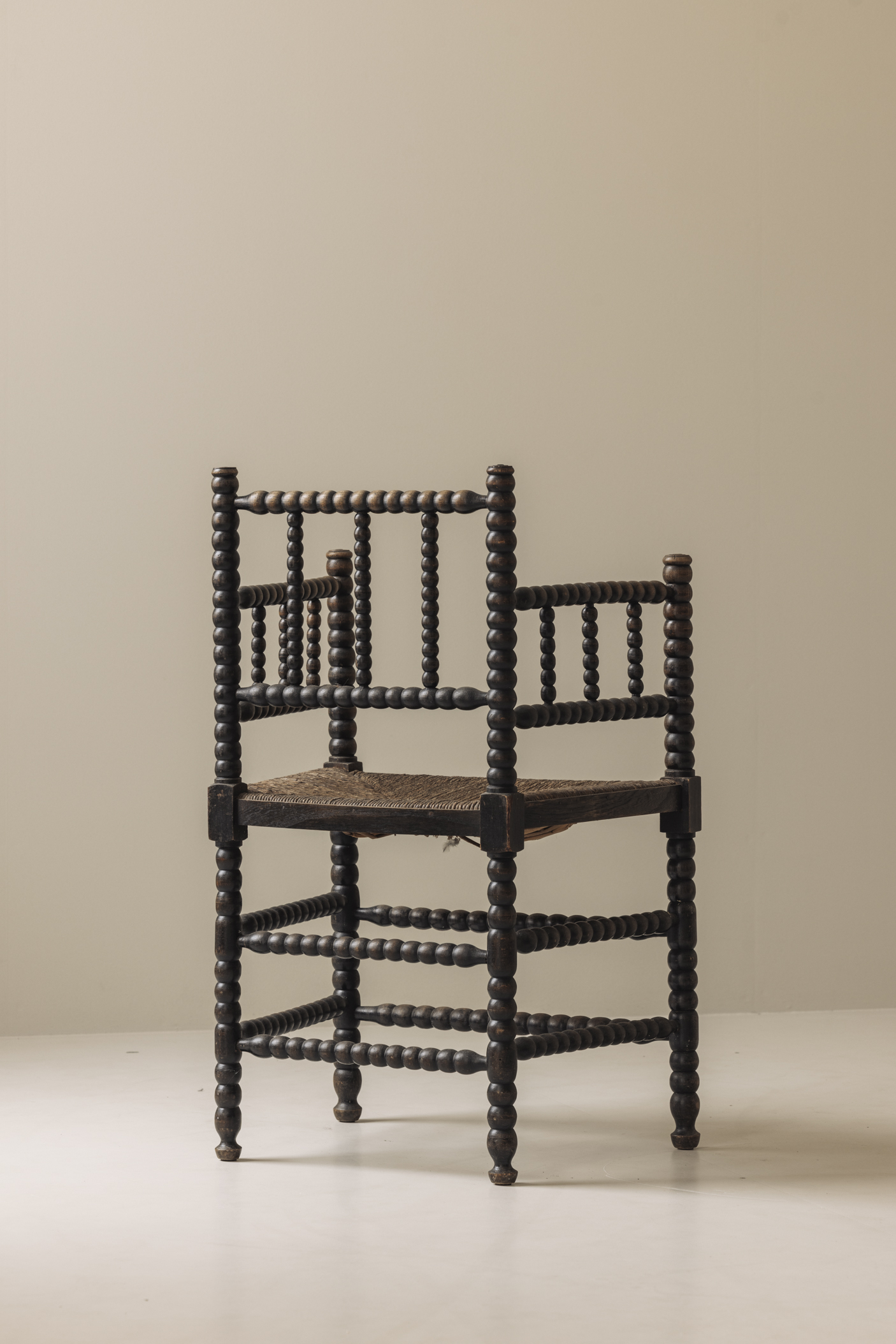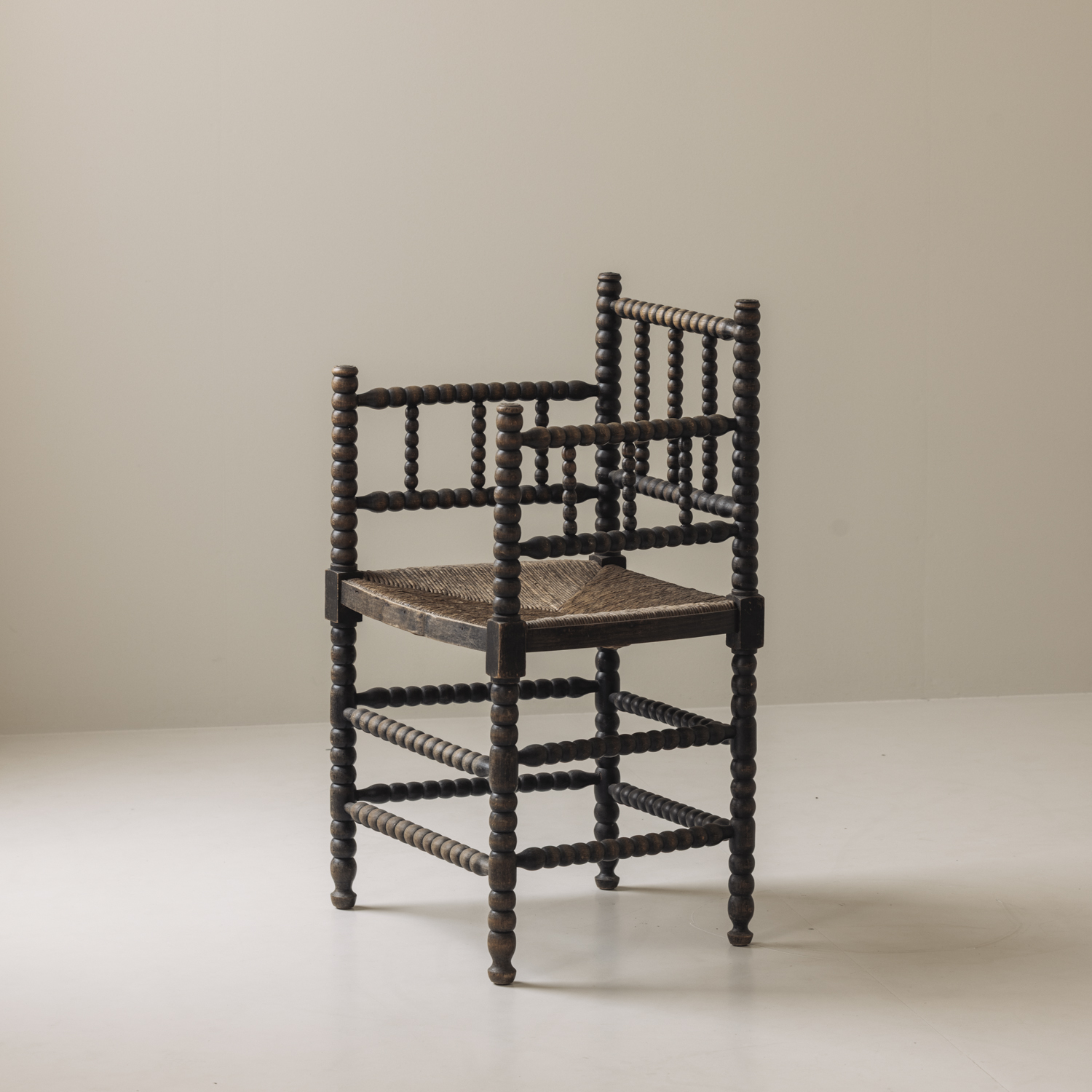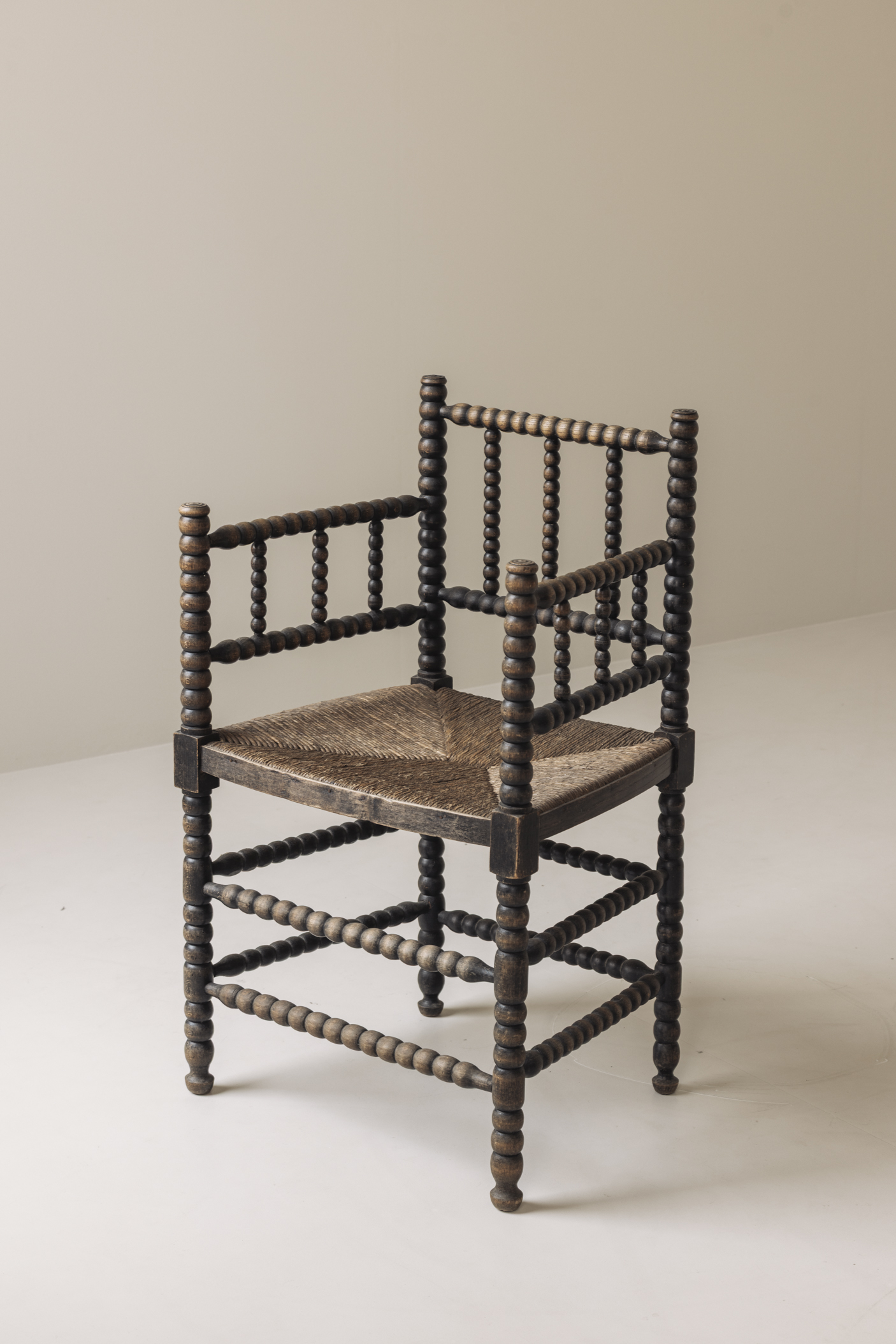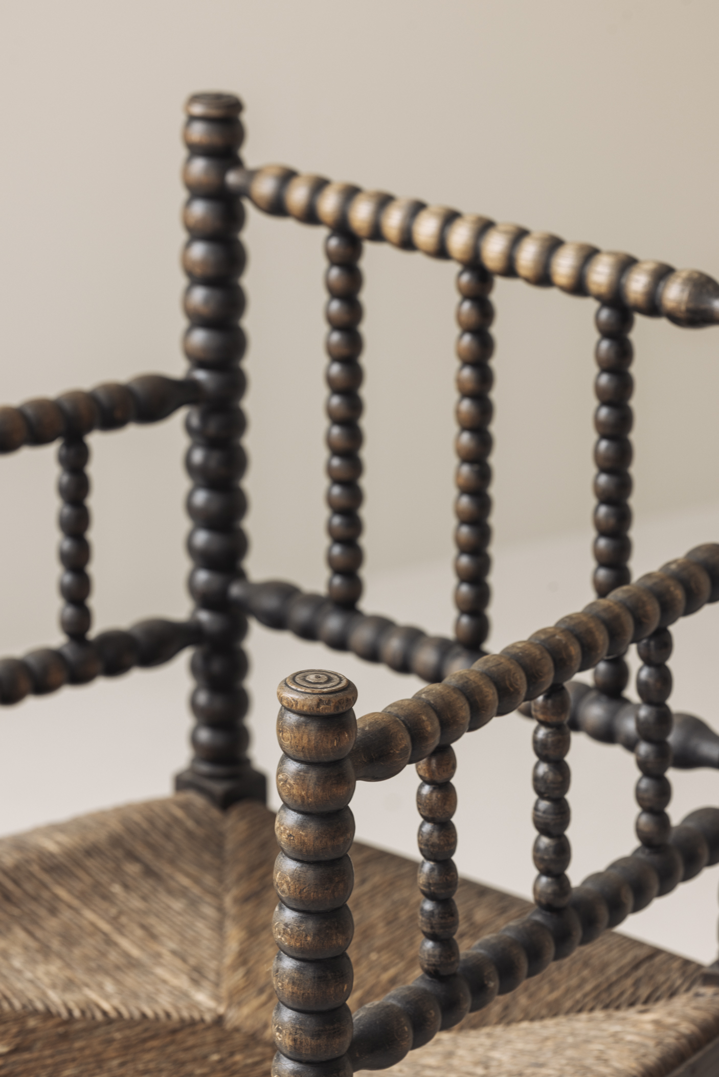 An exceptional early edition Bobbin chair, sourced in France and dating to the 1930s. This charming piece showcases the signature bobbin-turned legs and stretchers, a hallmark of traditional craftsmanship that adds rhythm and character to its silhouette. The chair features its original hand-woven rush seat, beautifully aged and full of rustic elegance. Offered in its untouched, original condition, the piece carries a warm patina that reflects its decades of use and care. A highly decorative and authentic example of early 20th-century French furniture, perfect as an accent chair or as part of a thoughtfully curated interior.